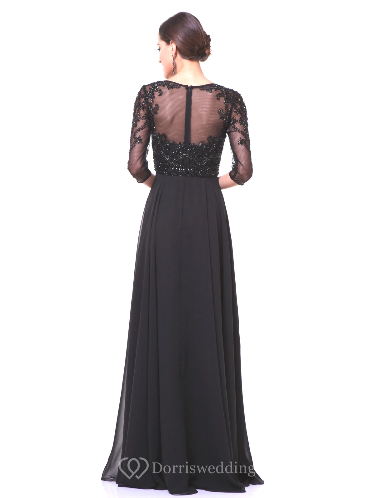 A-Line Floor-Length Bateau Half Sleeve Chiffon Illusion Dress With Beading