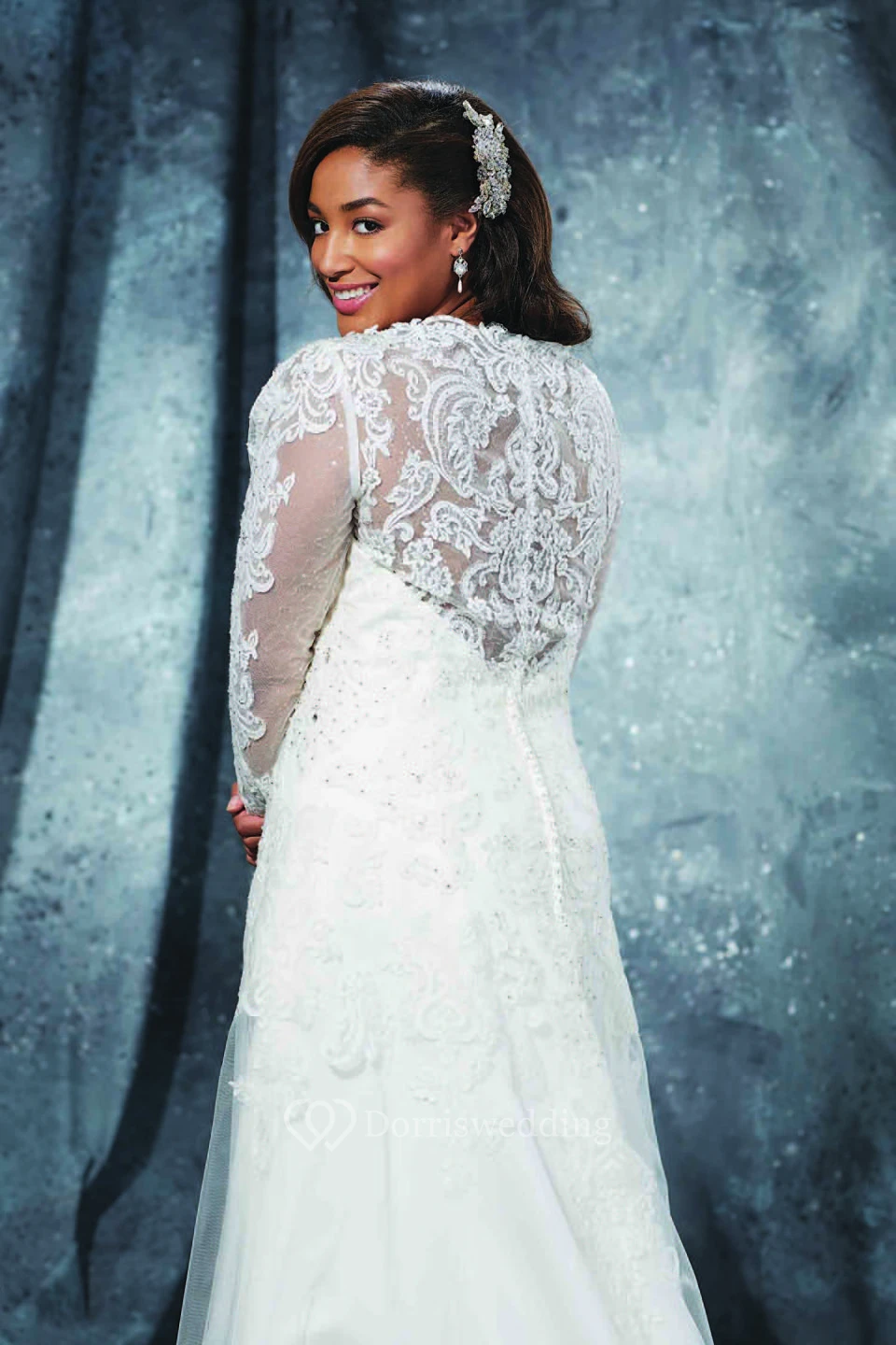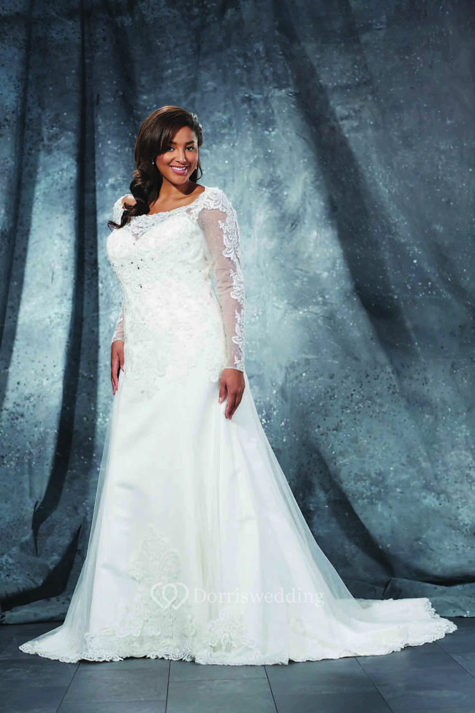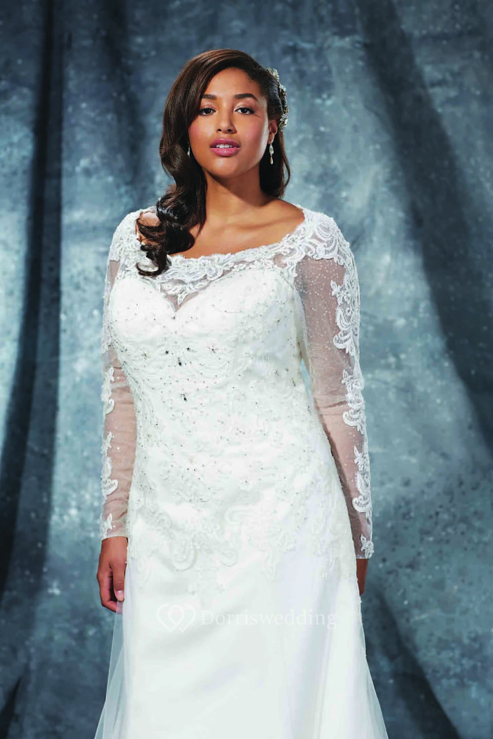 A-Line Floor-Length Bateau Neck Long Sleeve Lace Sweep Train Illusion Appliques Dress
