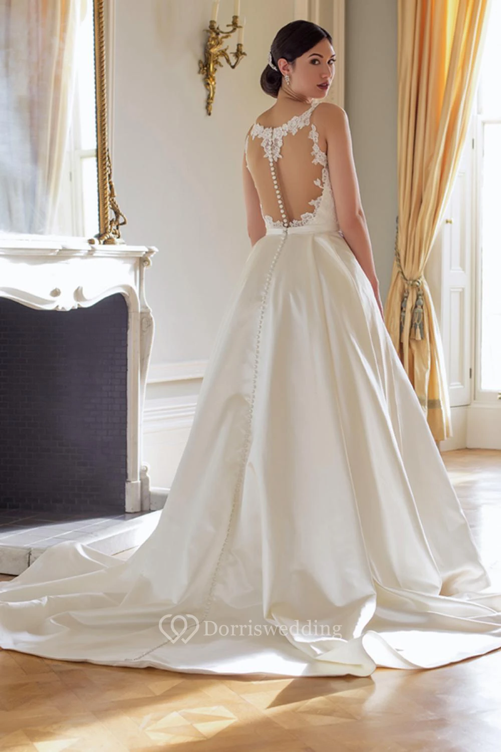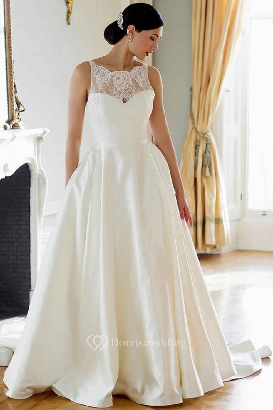 A-Line Floor-Length Bateau-Neck Sleeveless Satin&Lace Wedding Dress