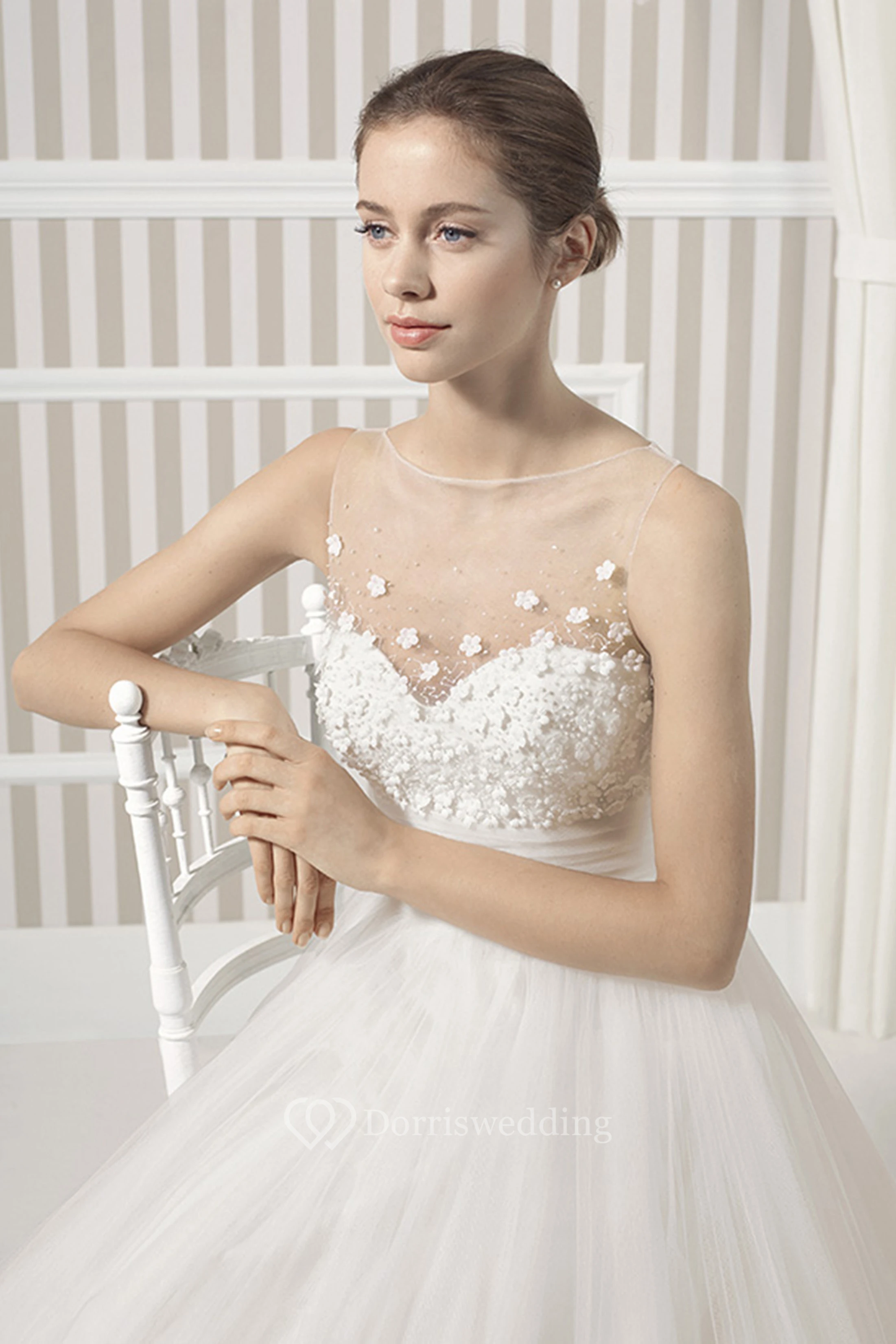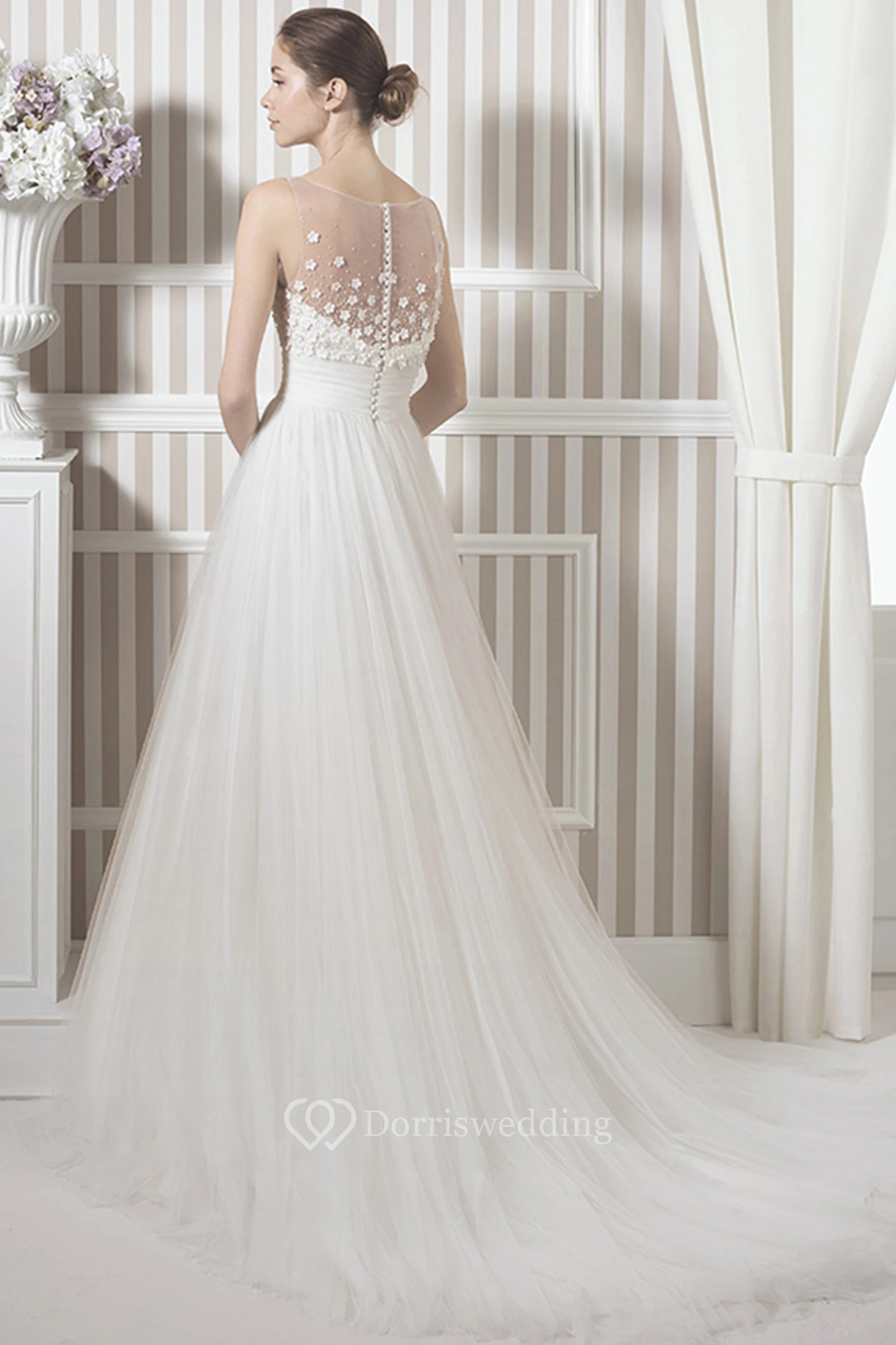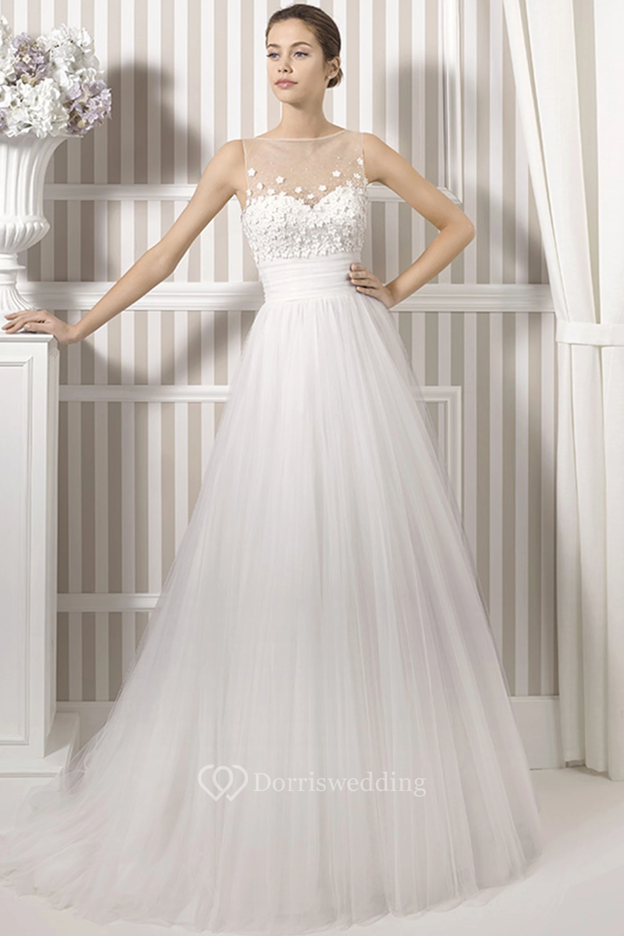 A-Line Floor-Length Bateau Sleeveless Floral Tulle Wedding Dress With Pleats And Illusion Back