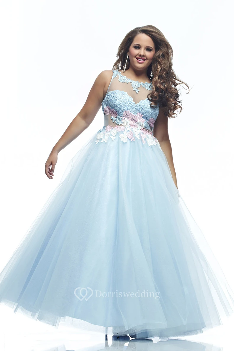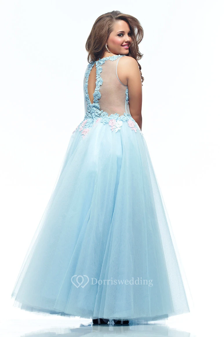 A-line Floor-length Bateau Sleeveless Tulle Appliques Pleats Illusion Dress
