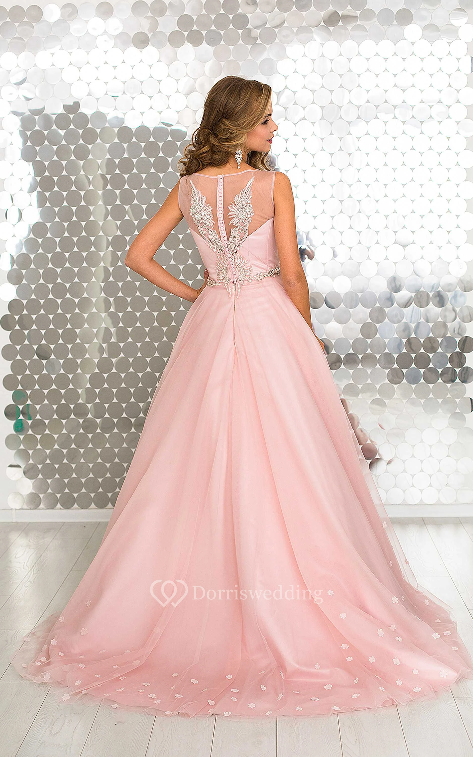 A-Line Floor-Length Bateau Sleeveless Tulle Beading Pleats Button Dress