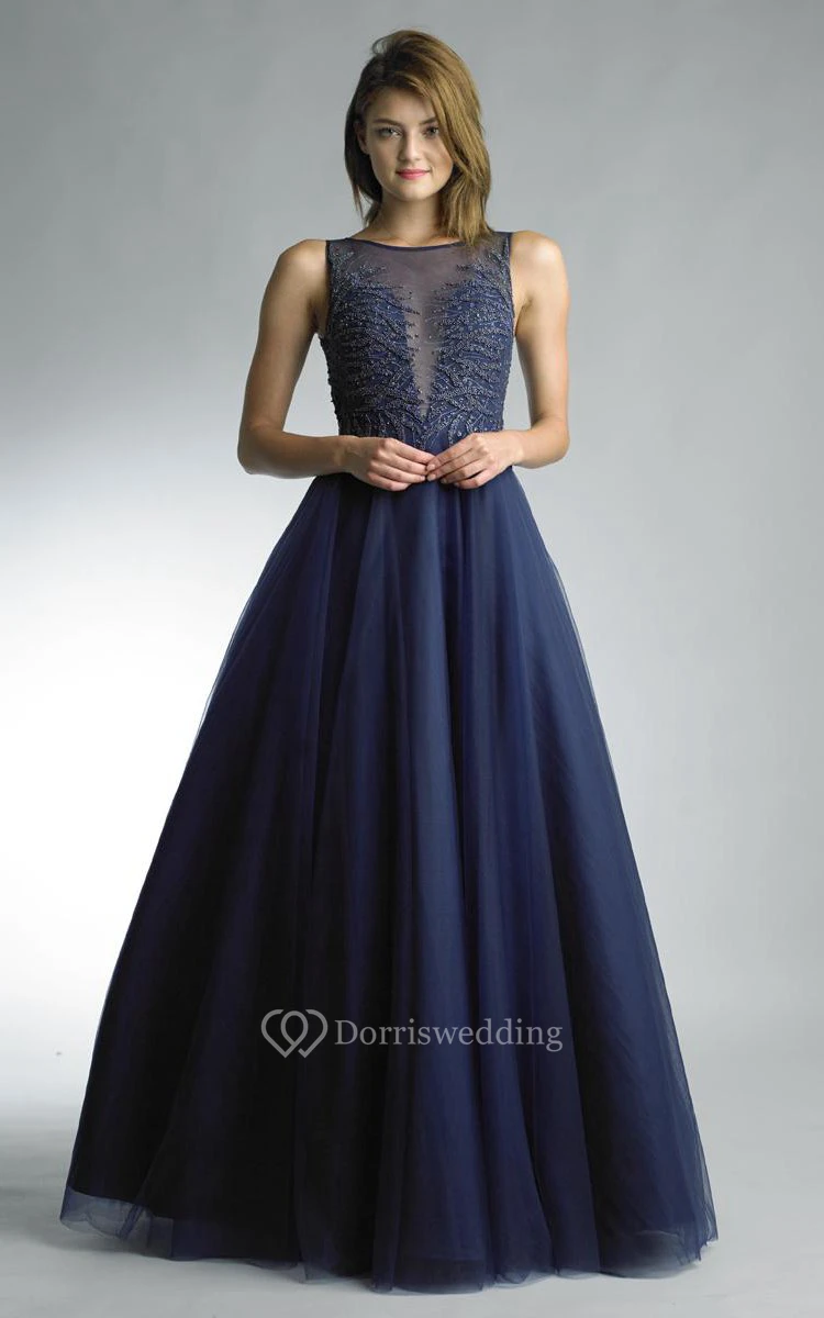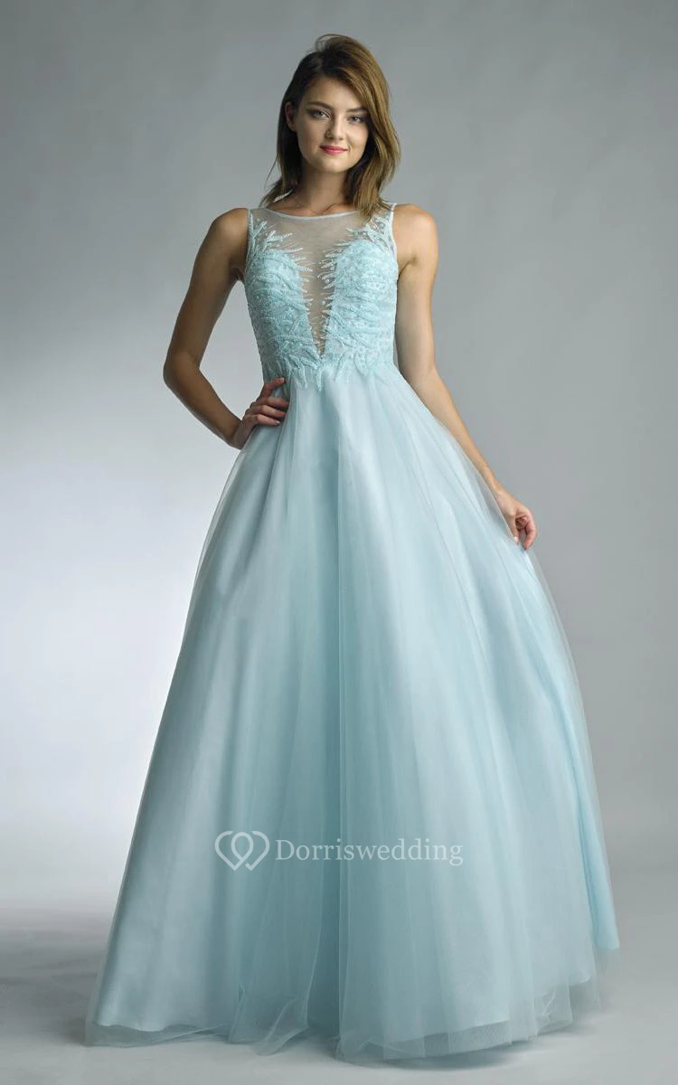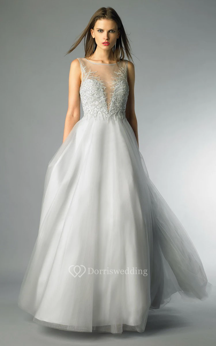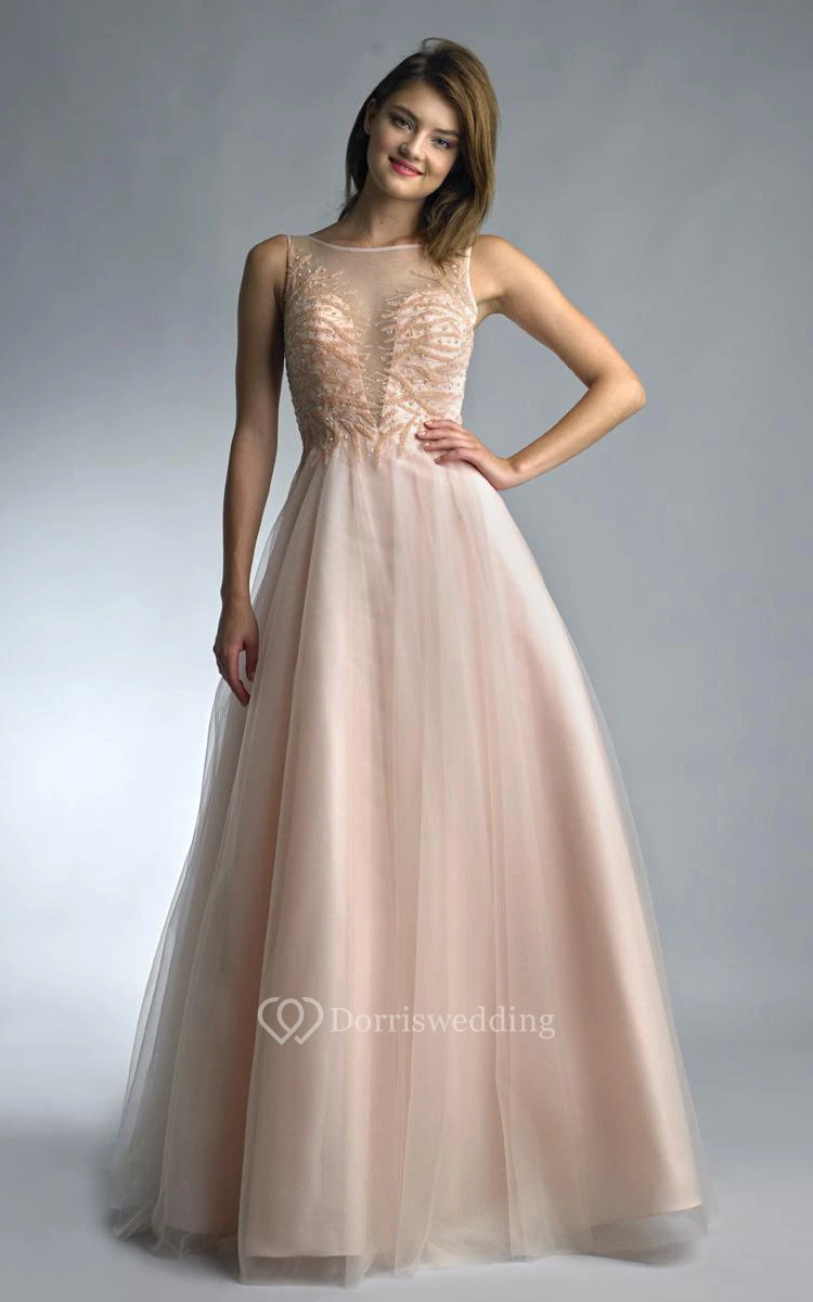 A-line Floor-length Bateau Sleeveless Tulle Low-V Back Dress