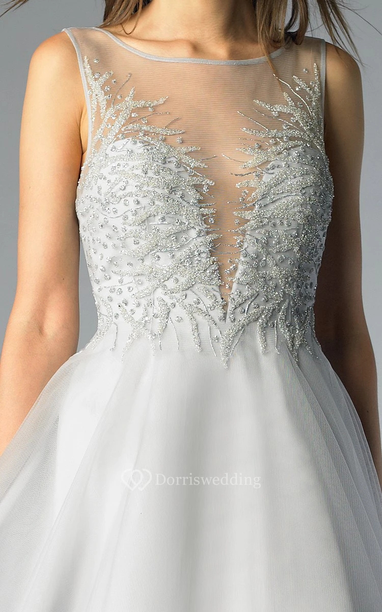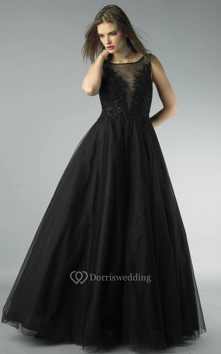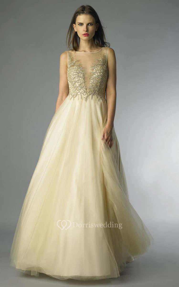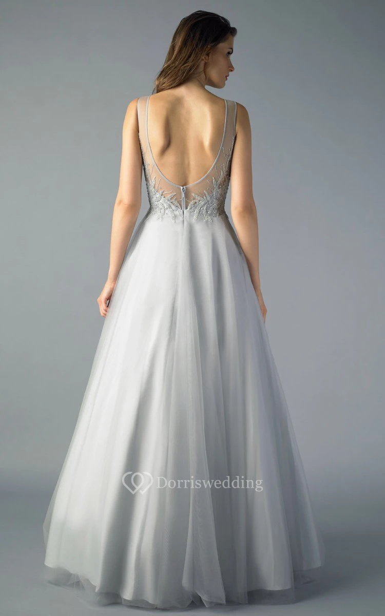 A-line Floor-length Bateau Sleeveless Tulle Low-V Back Dress