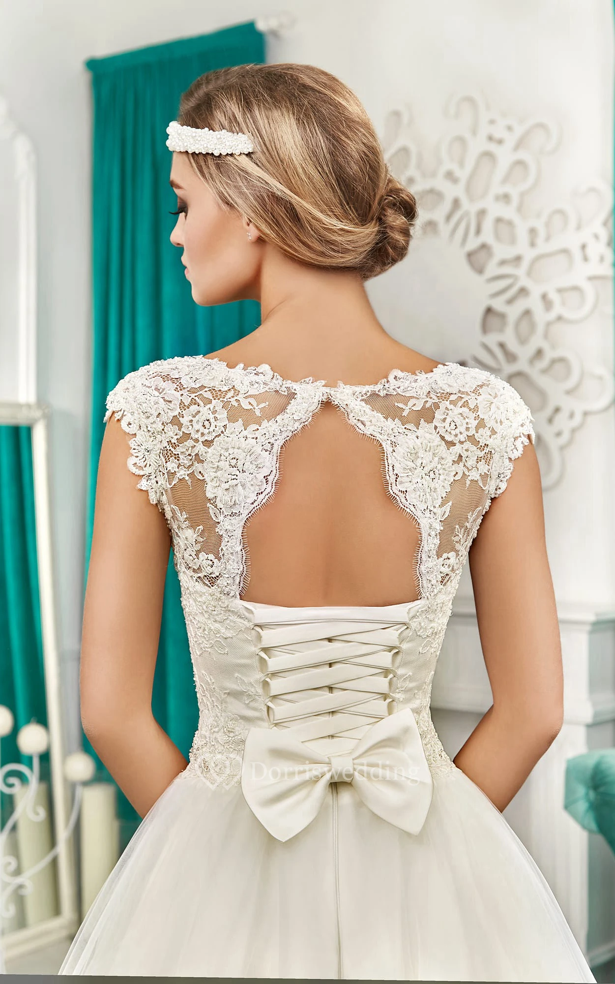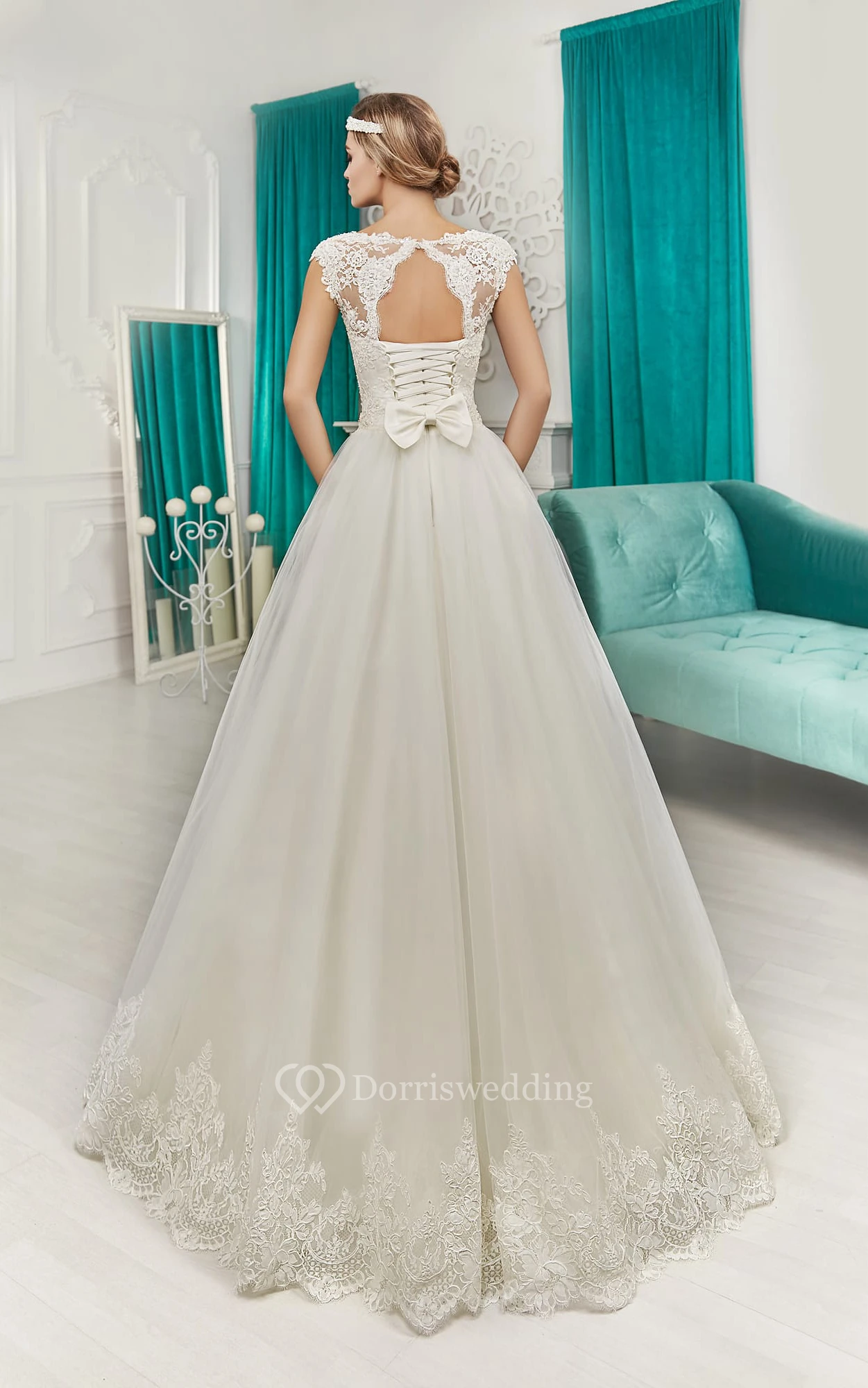 A-line Floor-length Cap Sleeve Bateau Keyhole Back Dress With Bow&Crystal Detailing