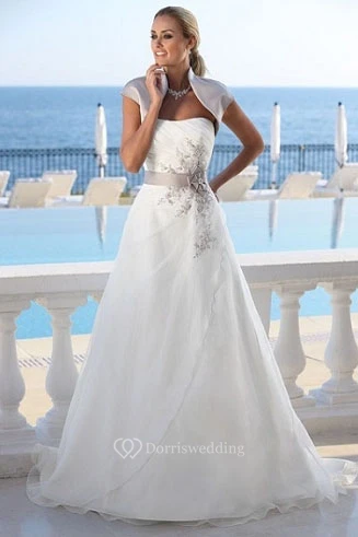 A-Line Floor-Length Cap-Sleeve Organza Wedding Dress With Side Draping And Appliques