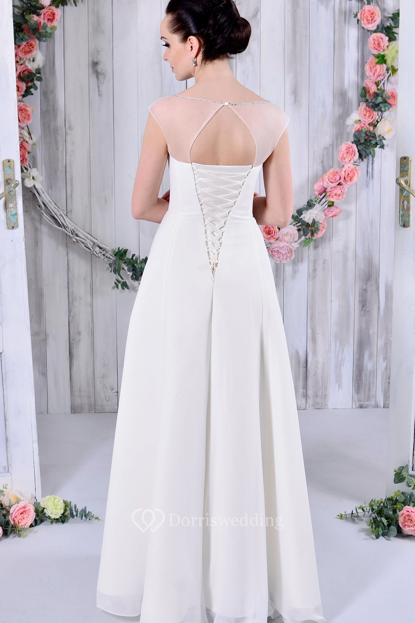 A-Line Floor-Length Criss-Cross Scoop-Neck Cap-Sleeve Chiffon Wedding Dress With Beading And Waist Jewellery