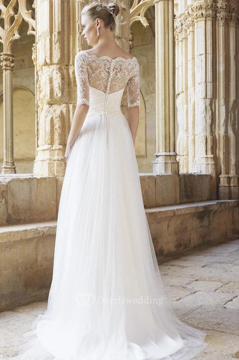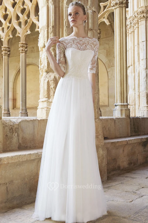 A-Line Floor-Length Half Sleeve Lace Bateau Neck Tulle Wedding Dress