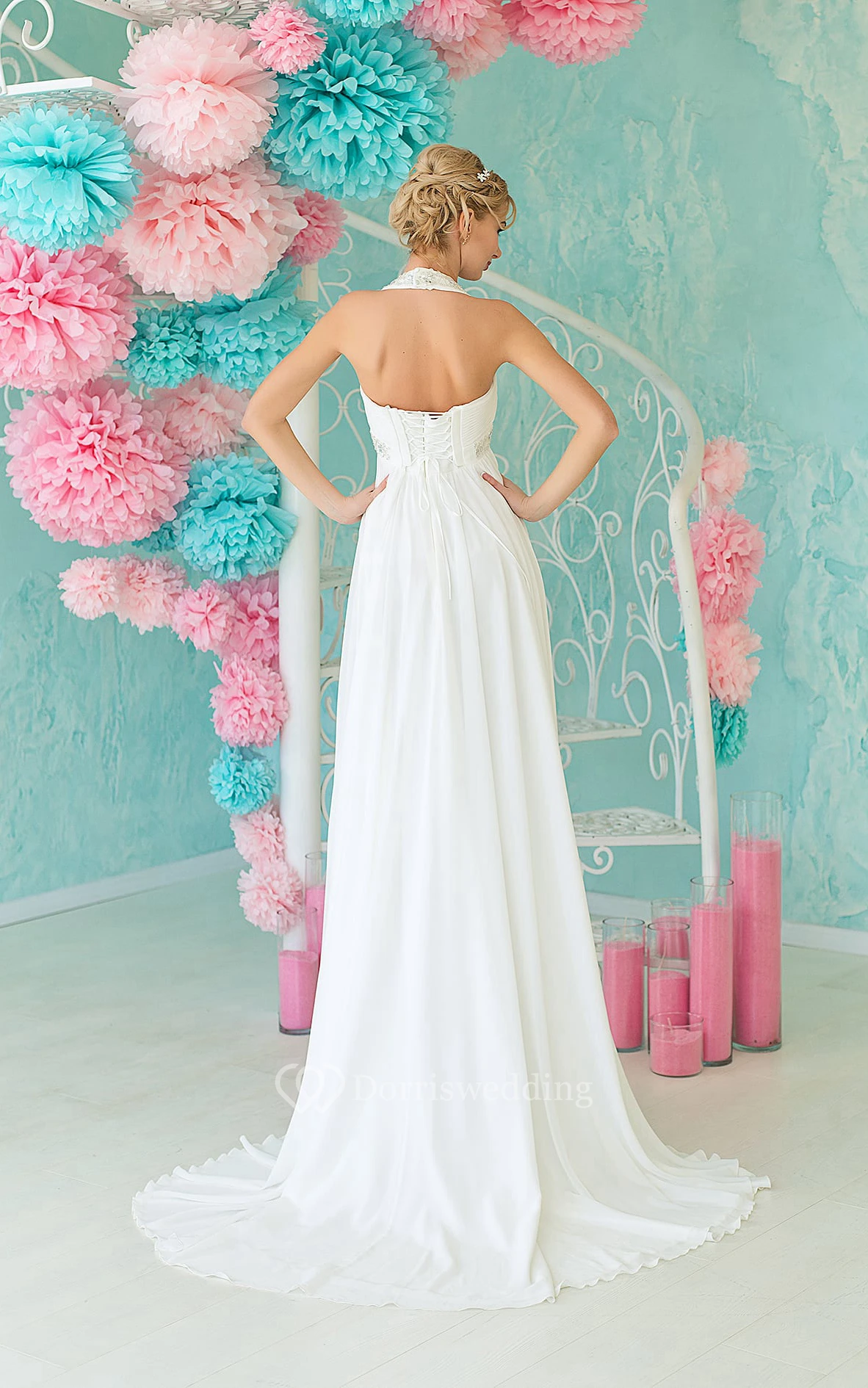 A-Line Floor-Length Halter Sleeveless Empire Lace-Up Chiffon Dress With Beading And Pleats