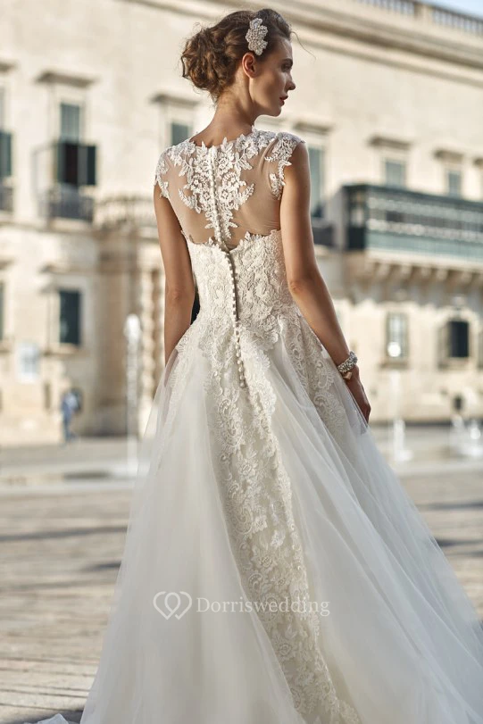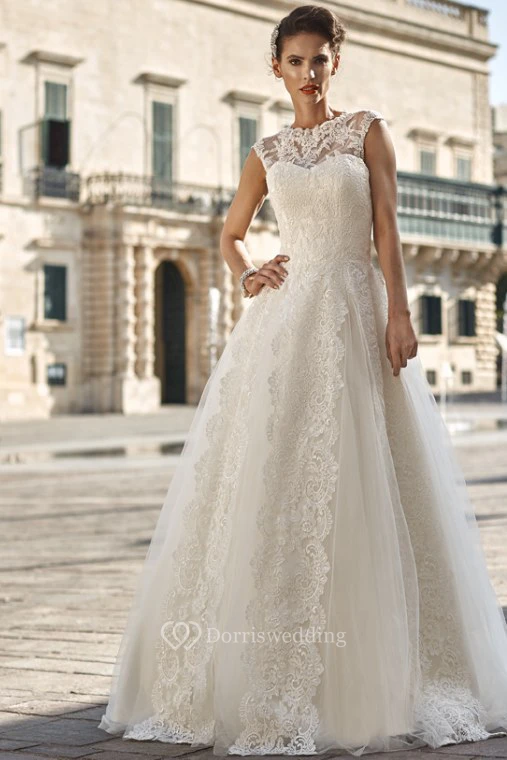 A-Line Floor-Length High-Neck Cap-Sleeve Appliqued Lace&Tulle Wedding Dress With Pleats