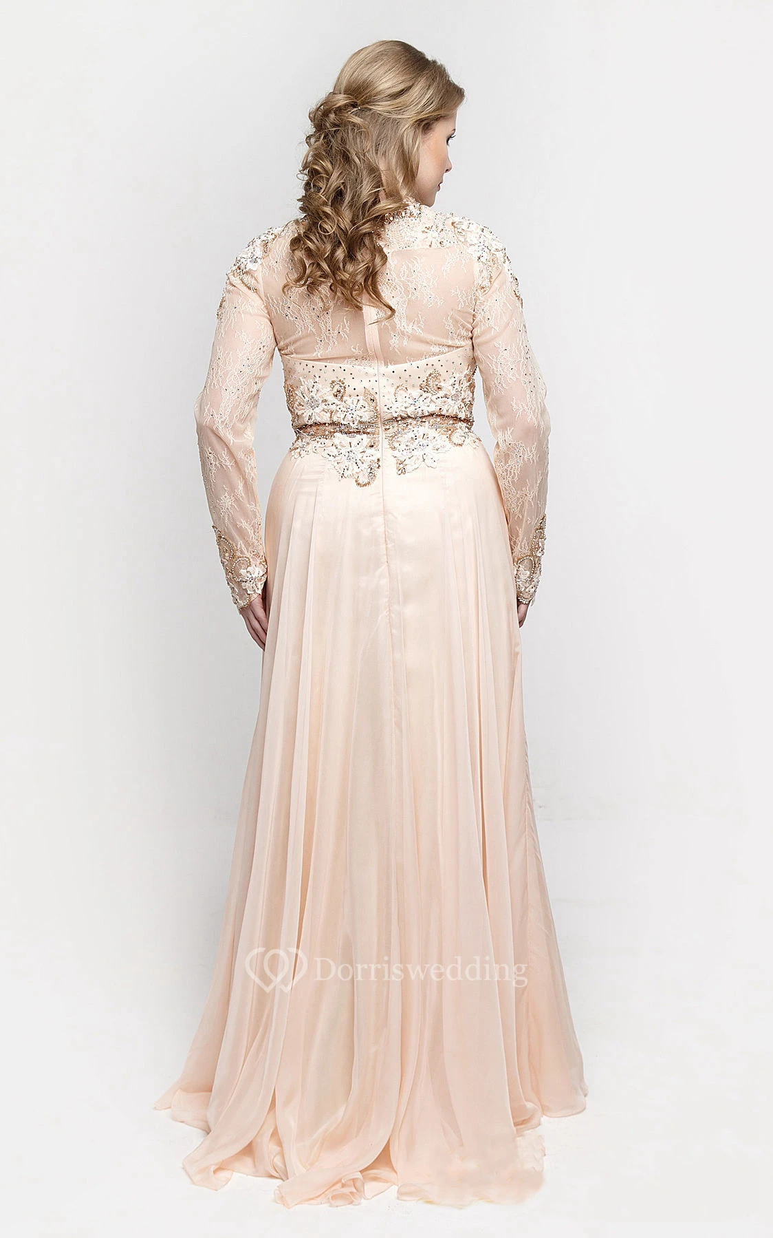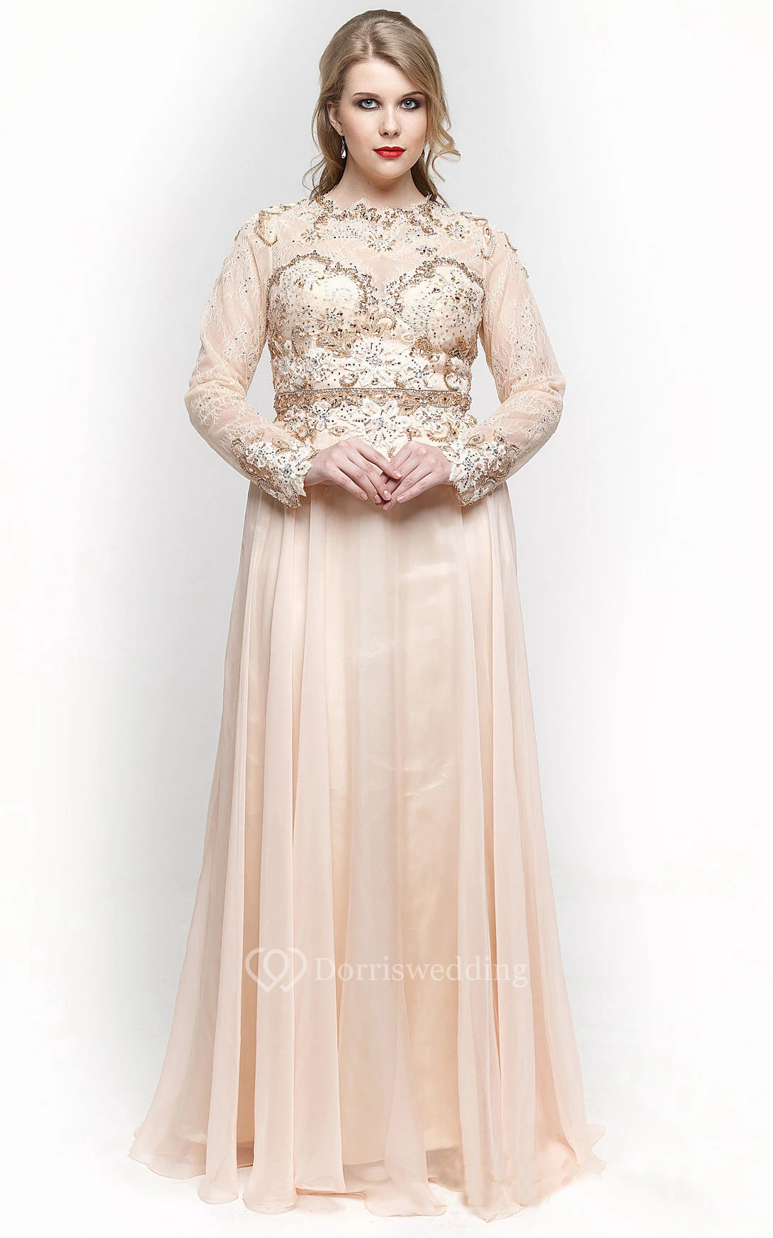 A-Line Floor-Length High-Neck Long Sleeve Chiffon Pleats Beading Zipper Dress