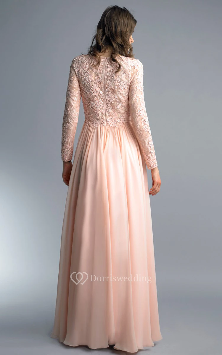 A-line Floor-length High Neck Long Sleeve Chiffon Zipper Dress