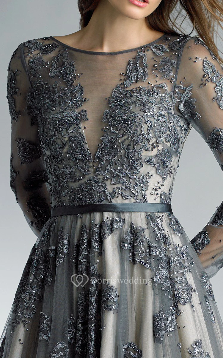 A-line Floor-length High Neck Long Sleeve Tulle Zipper Dress