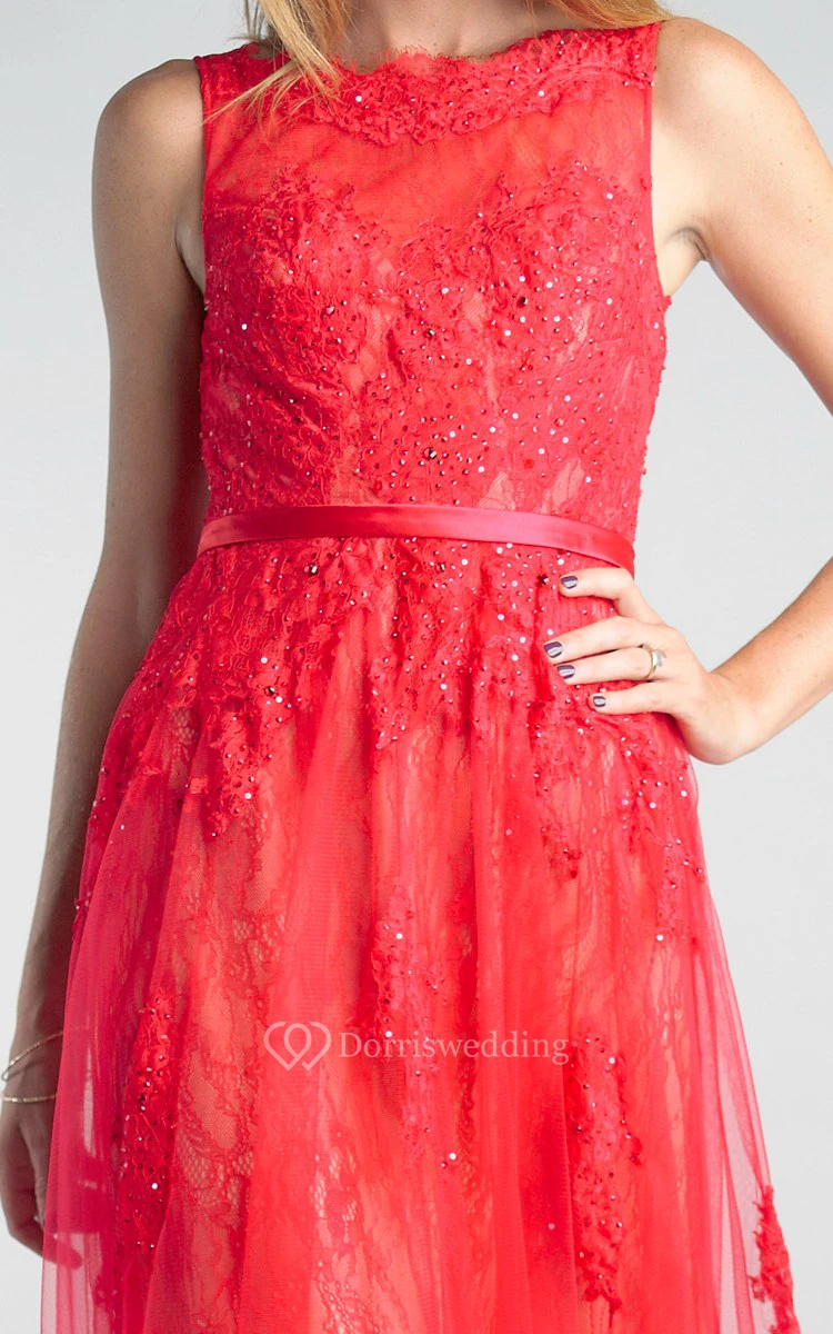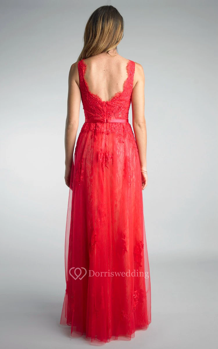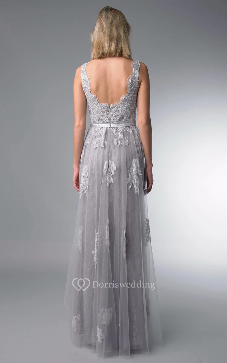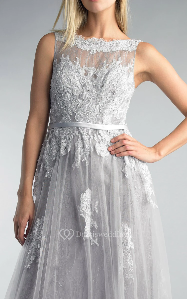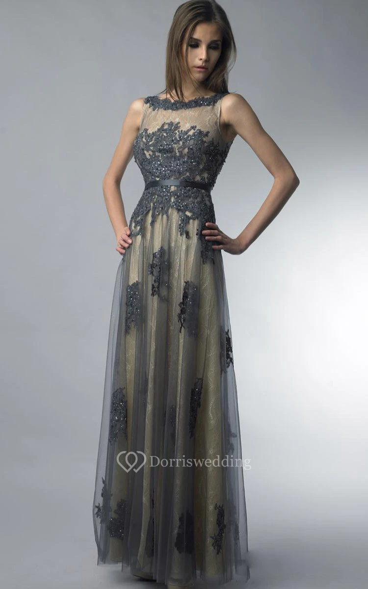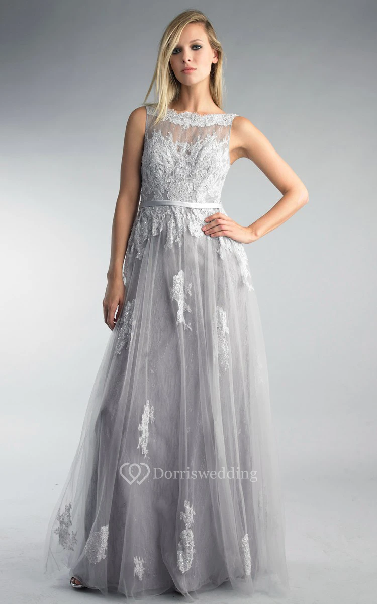 A-line Floor-length High Neck Sleeveless Tulle Low-V Back Dress