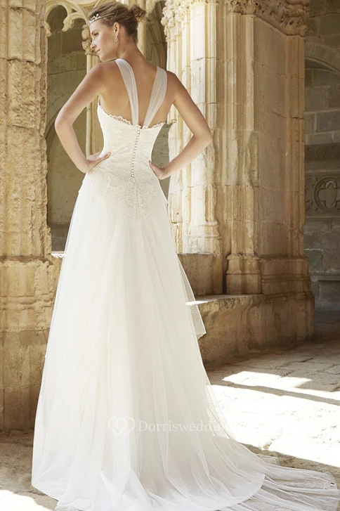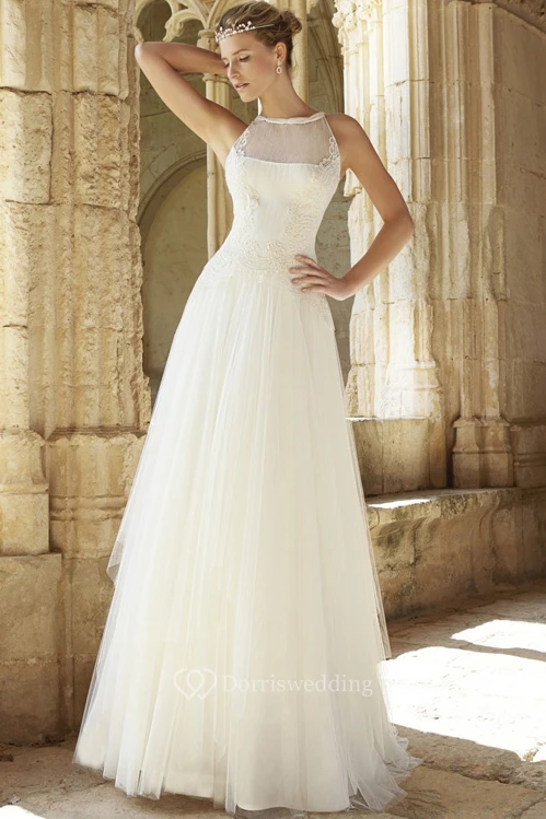 A-Line Floor-Length Jewel Appliqued Sleeveless Tulle Wedding Dress With Low-V Back And Court Train