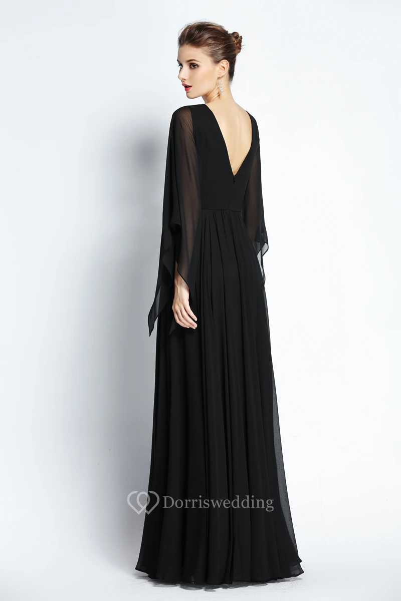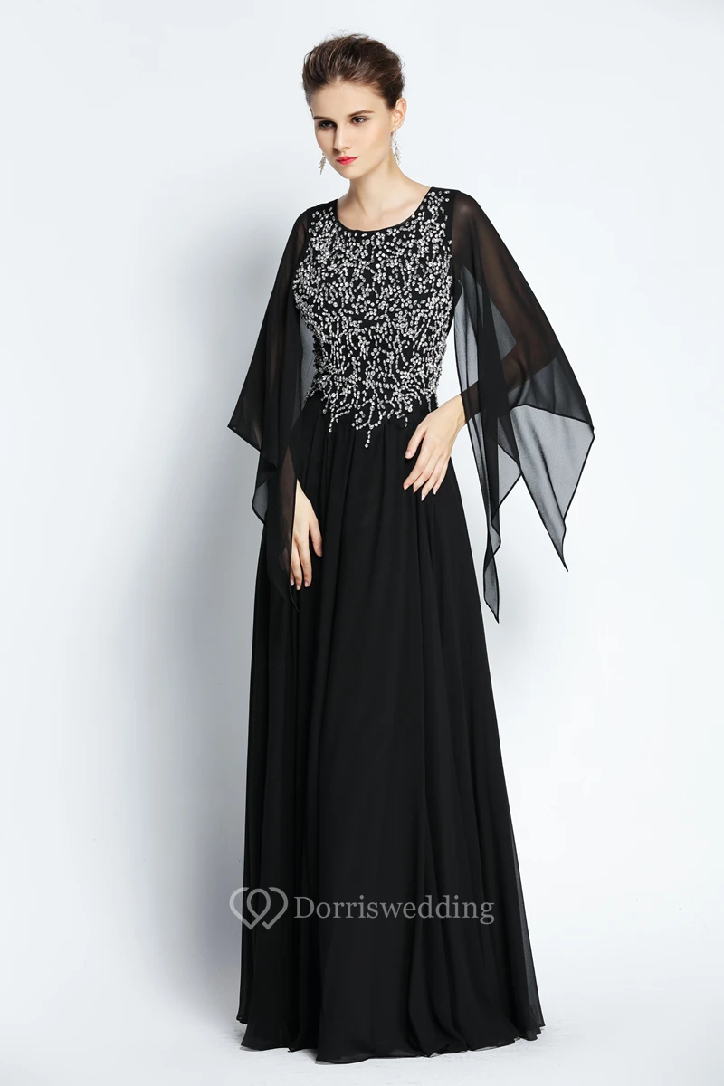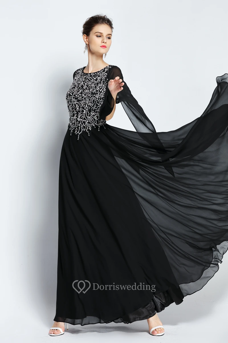 A-Line Floor-length Jewel Chiffon Long Sleeve Prom Dress with Beading and Pleats