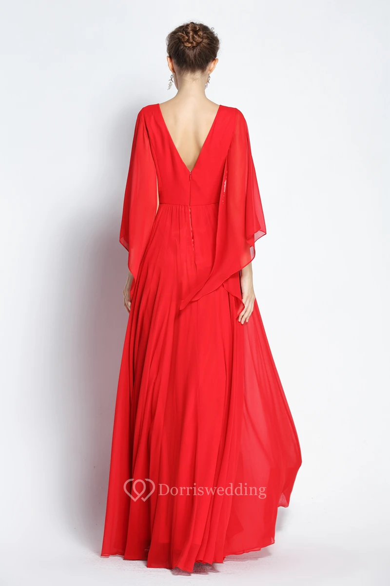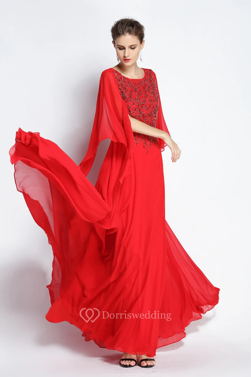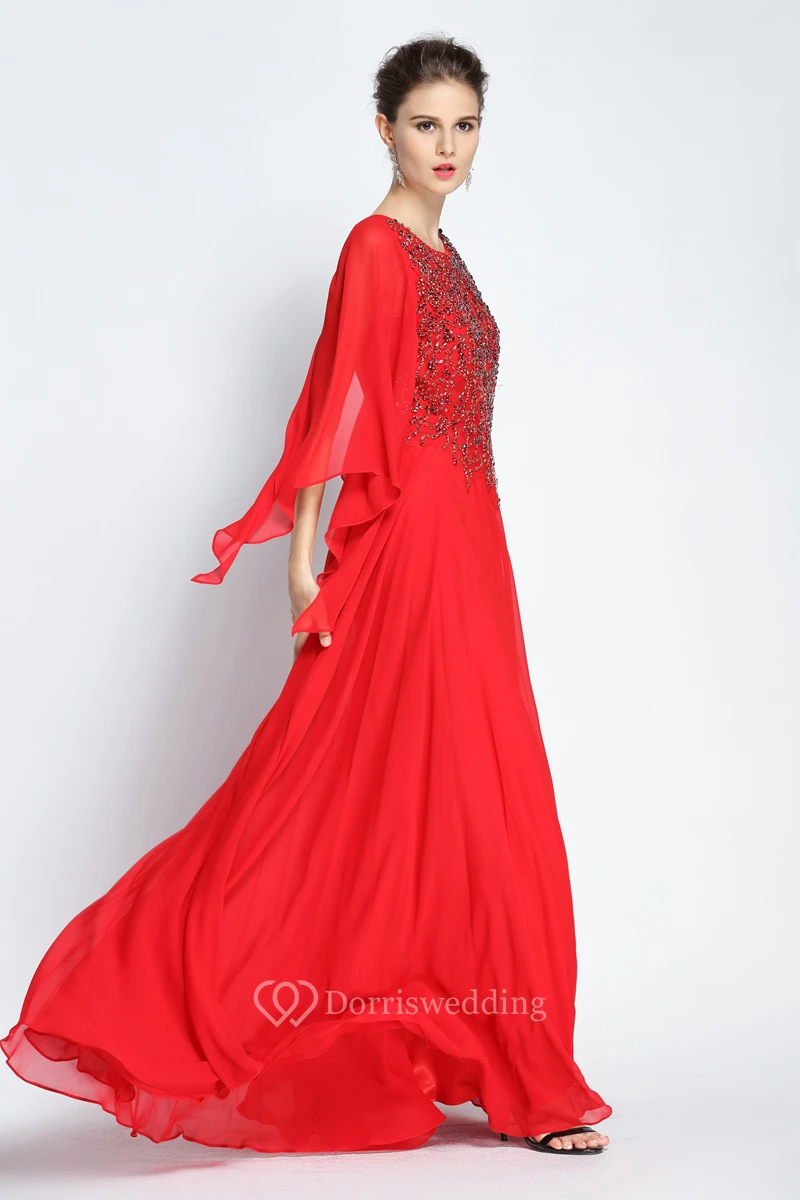 A-Line Floor-length Jewel Chiffon Long Sleeve Prom Dress with Beading and Pleats