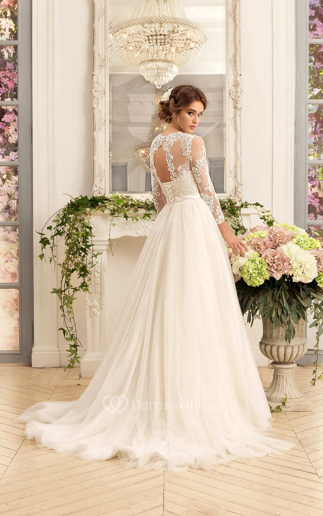 A-Line Floor-Length Jewel Illusion-Sleeve Lace-Up Tulle Dress With Appliques And Pleats