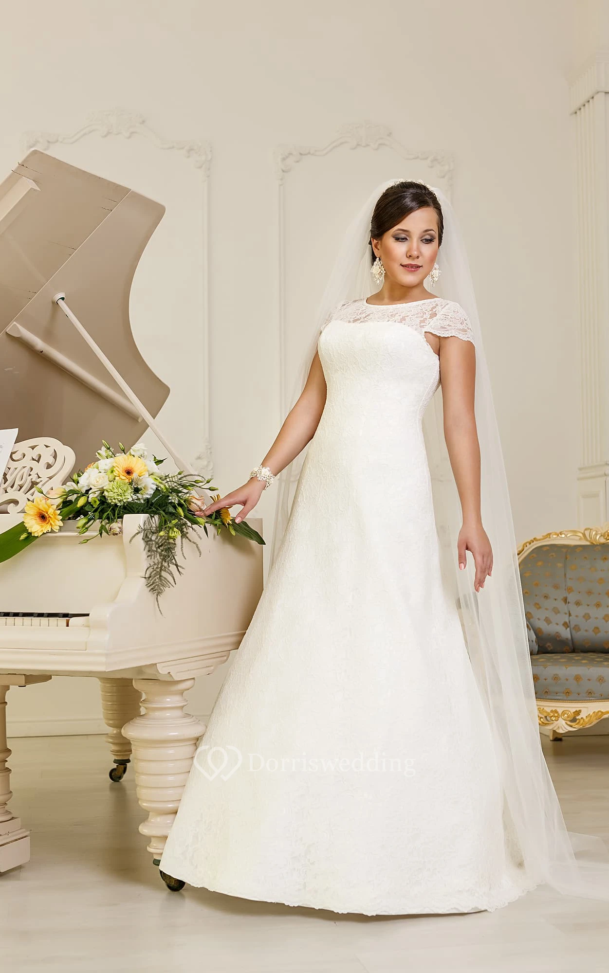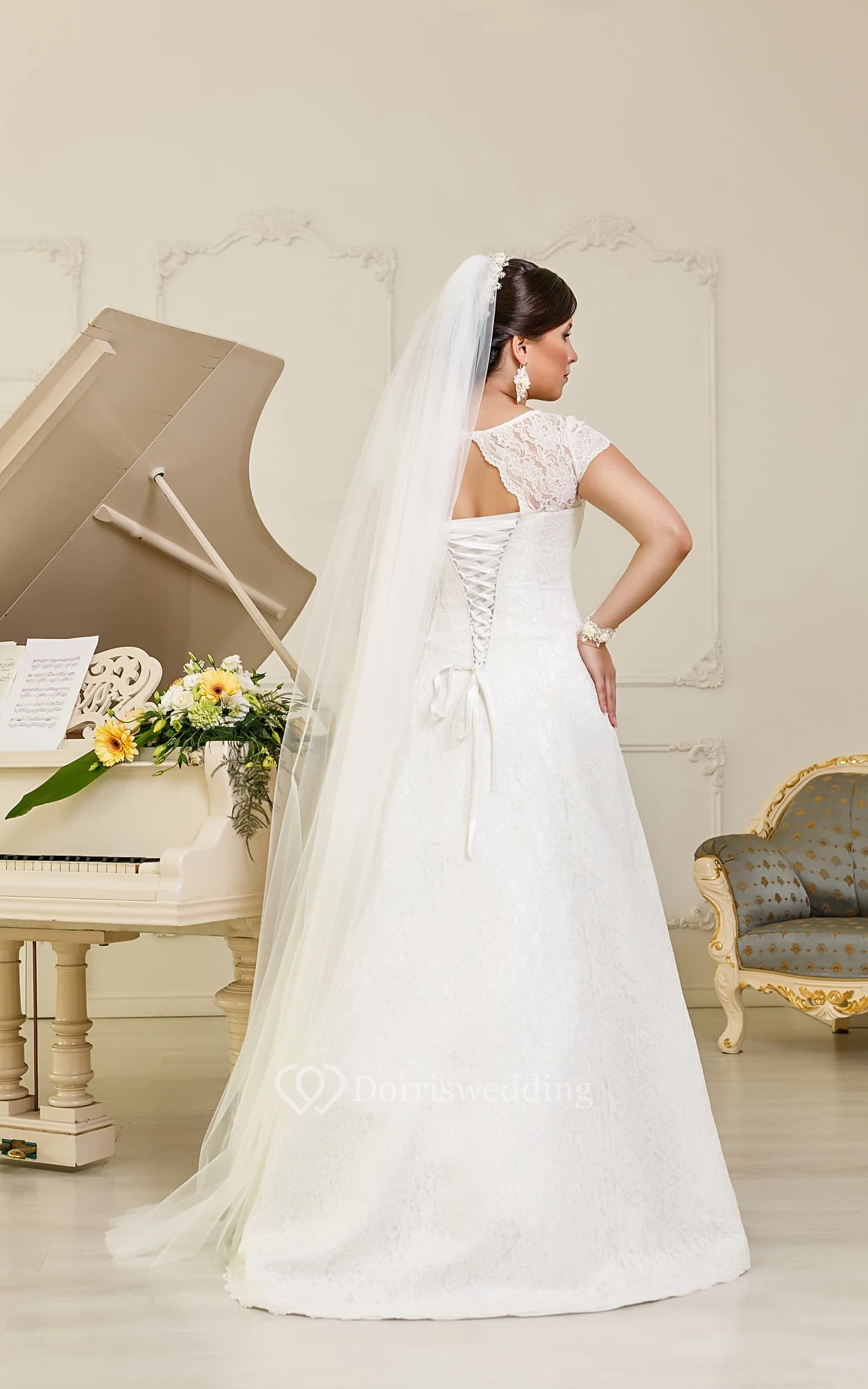 A-Line Floor-Length Jewel-Neck Cap-Sleeve Lace-Up Lace Dress