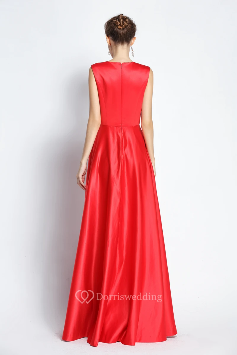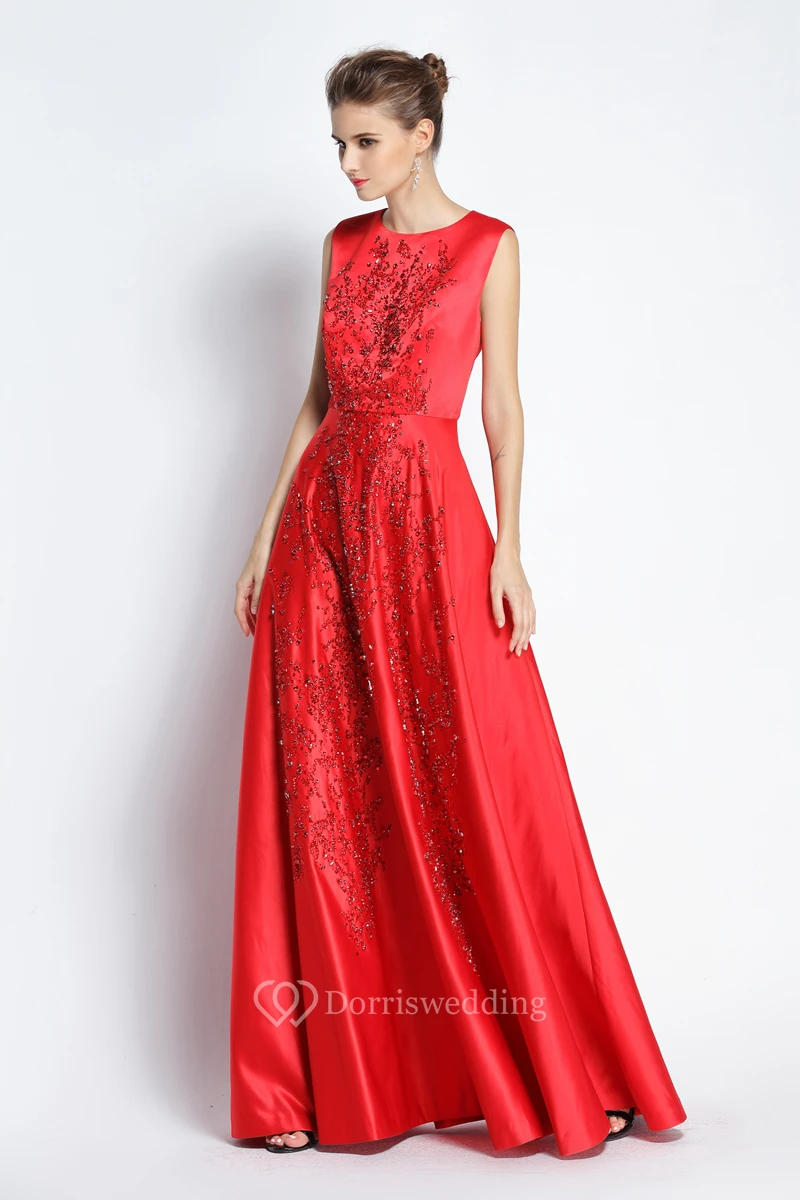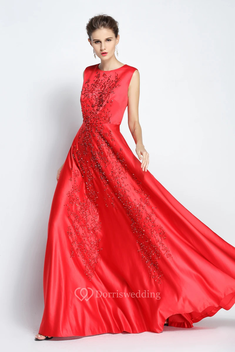 A-Line Floor-length Jewel Satin Sleeveless Prom Dress with Beading