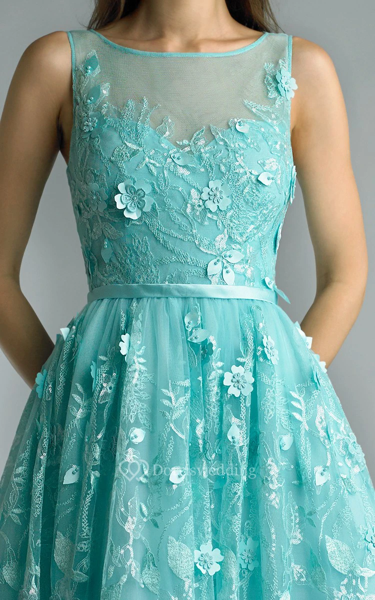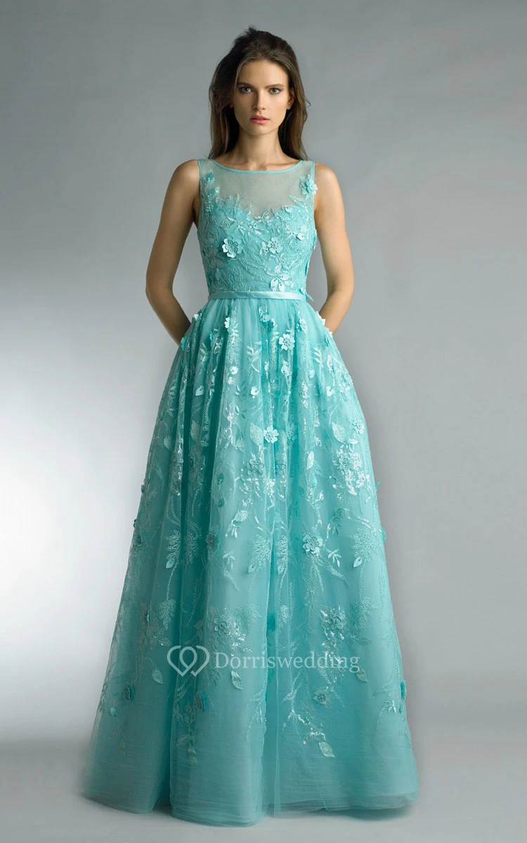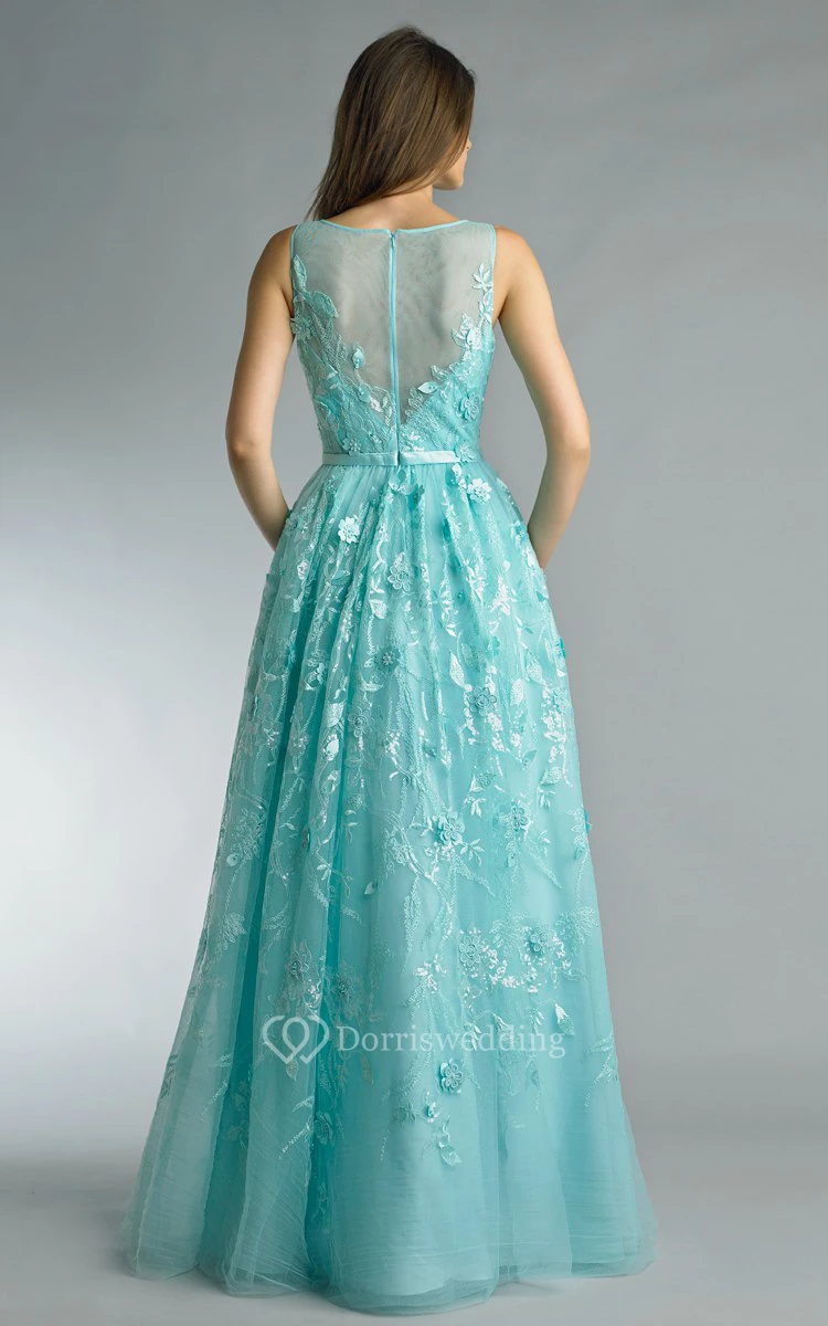 A-line Floor-length Jewel Sleeveless Tulle Illusion Dress