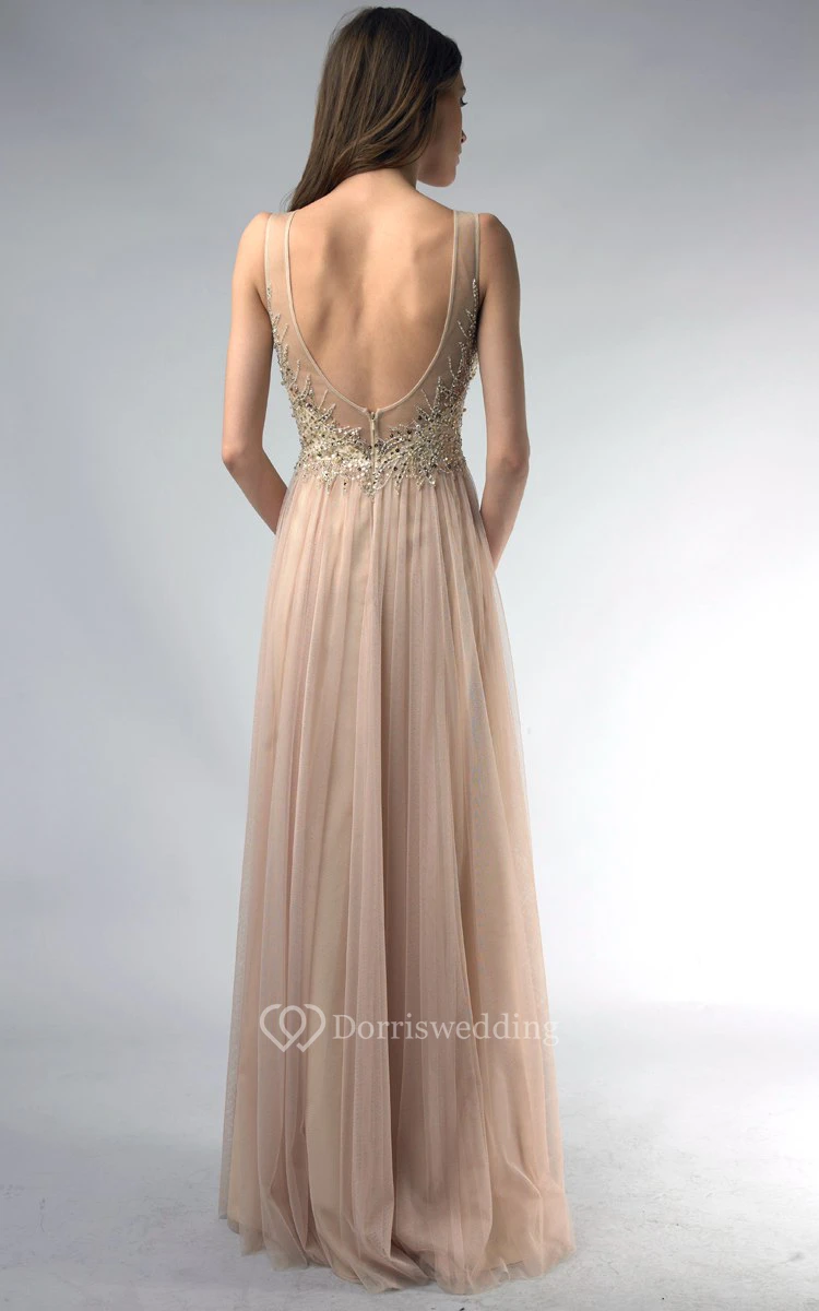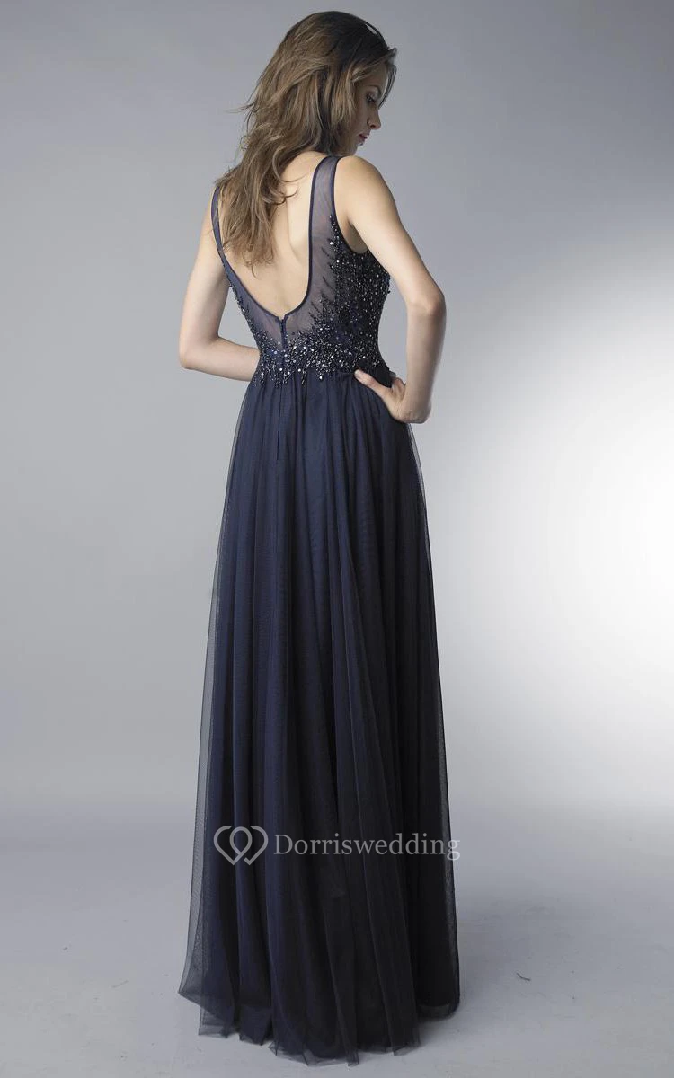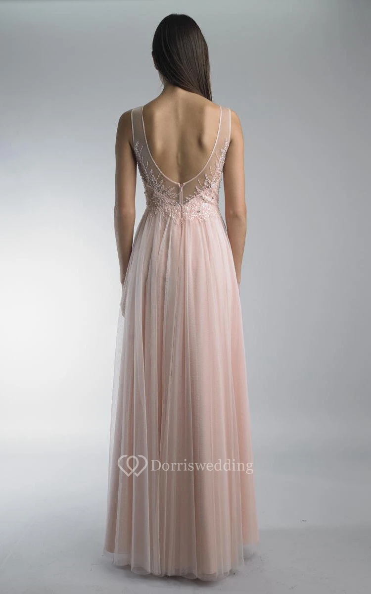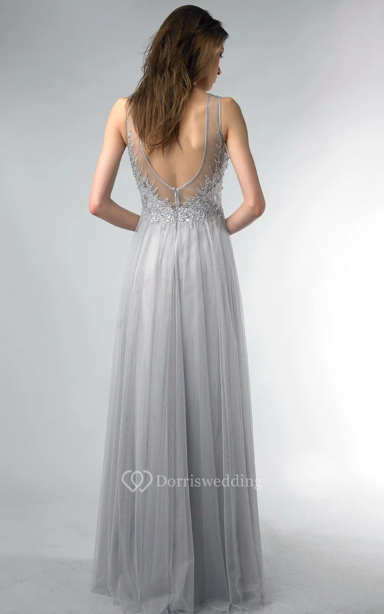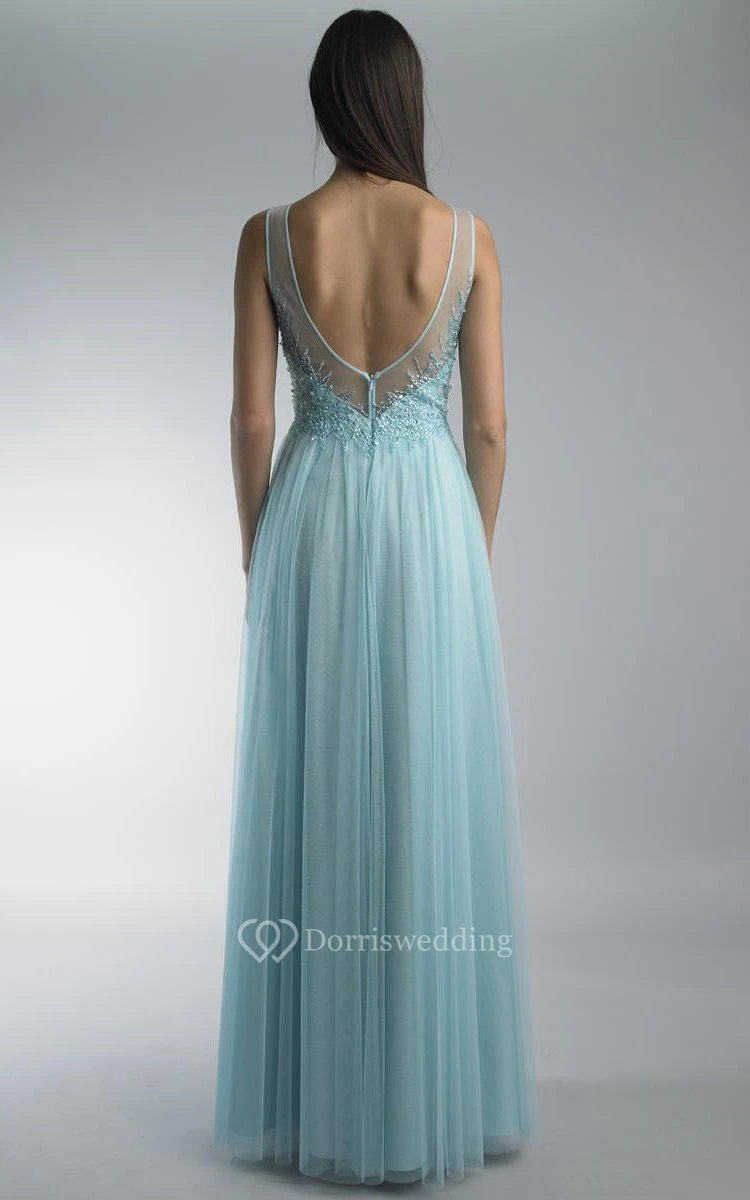 A-line Floor-length Jewel Sleeveless Tulle Low-V Back Dress
