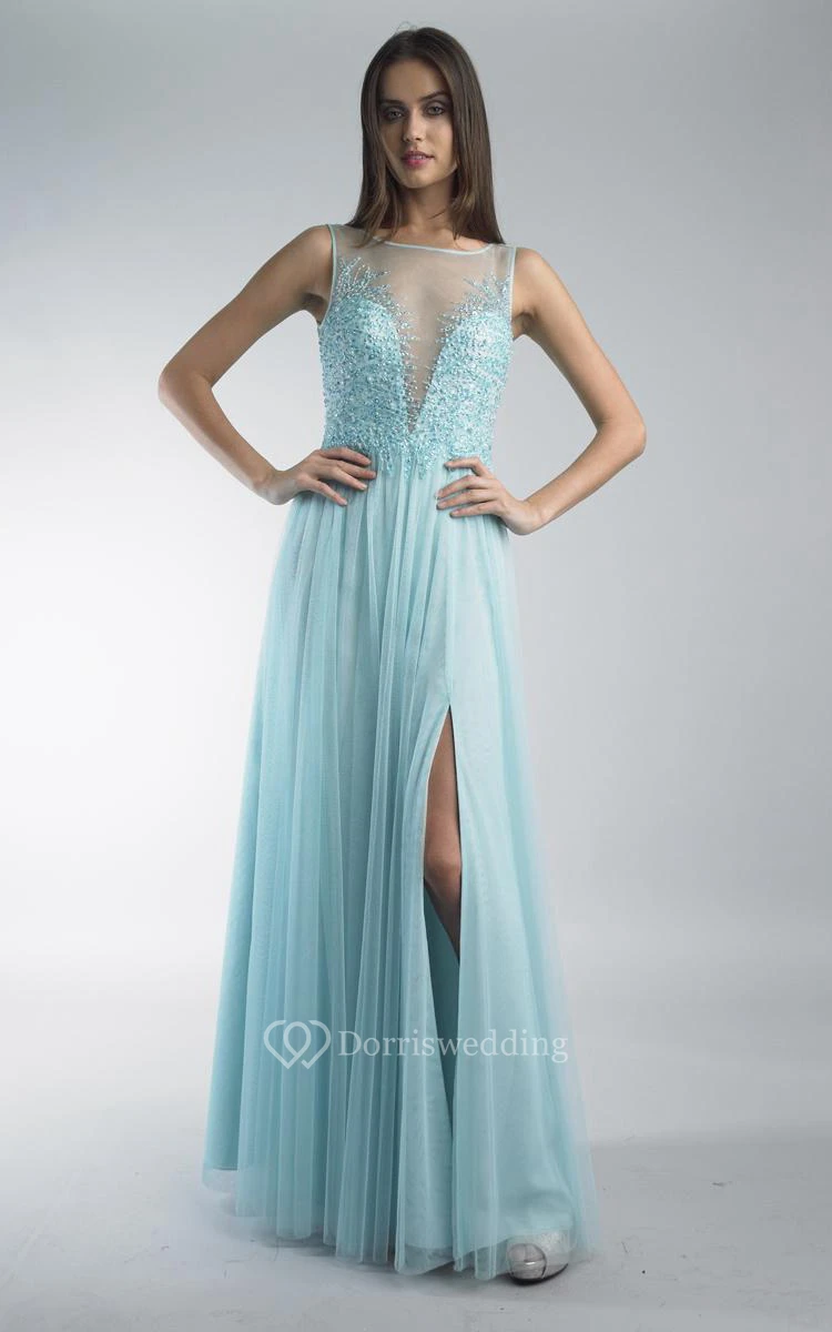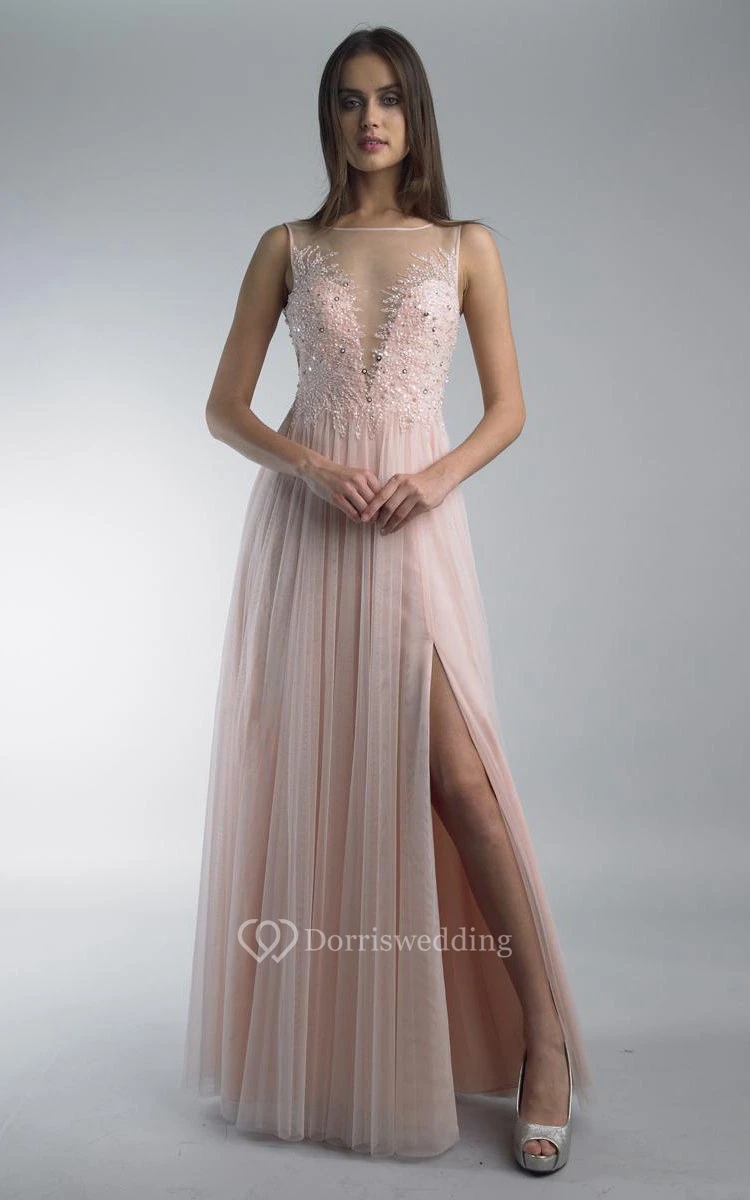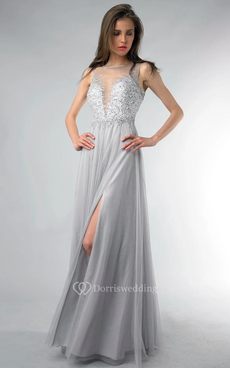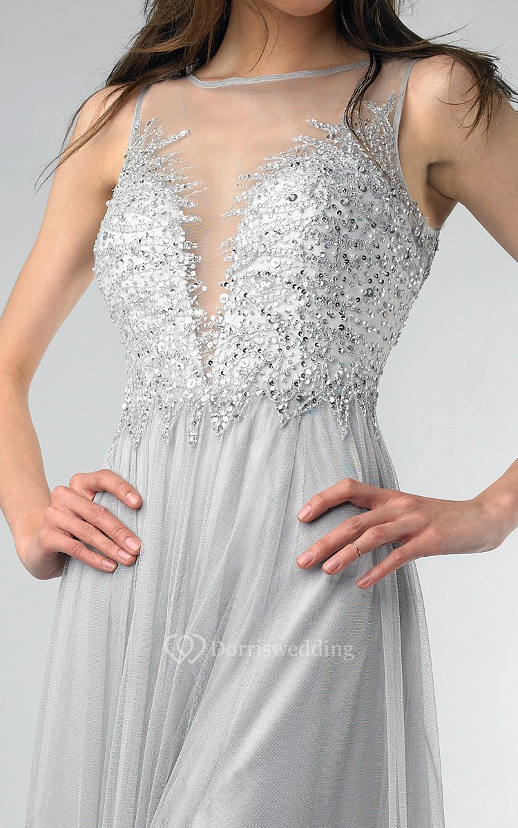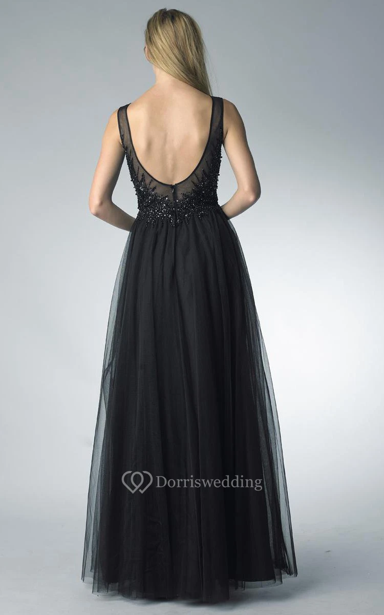 A-line Floor-length Jewel Sleeveless Tulle Low-V Back Dress