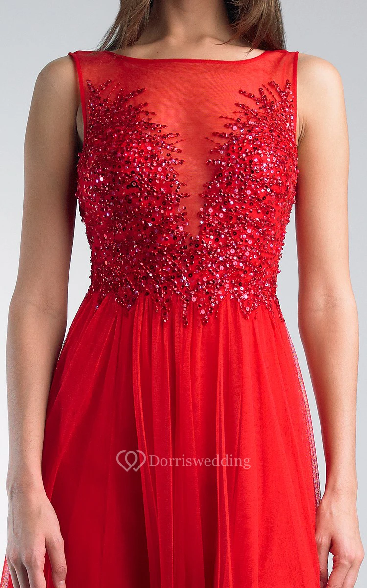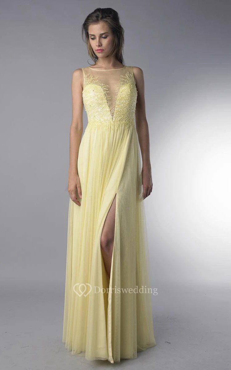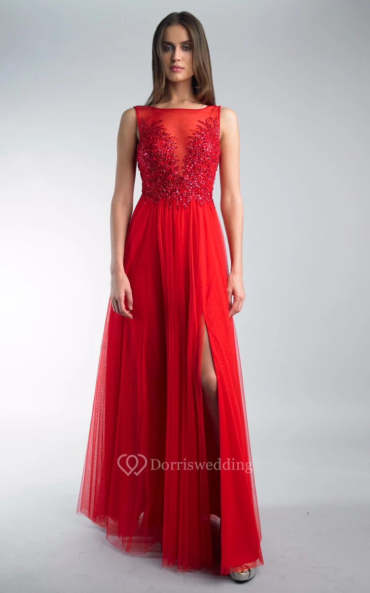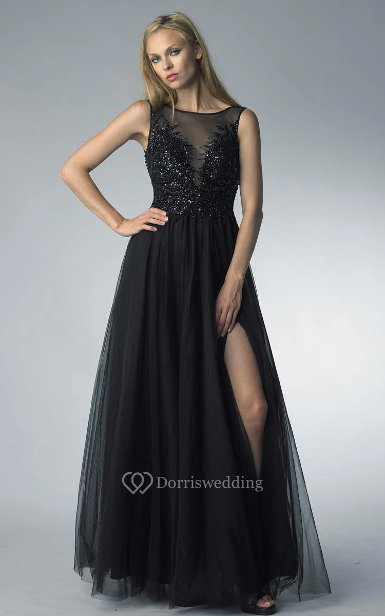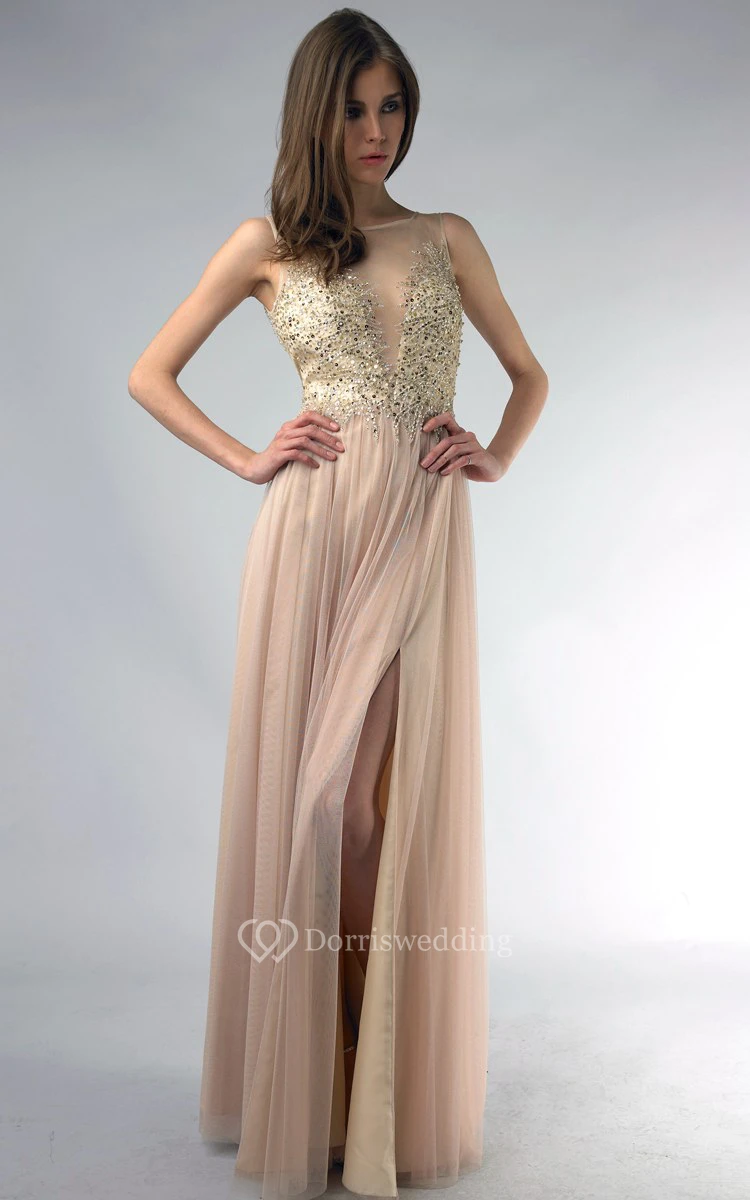 A-line Floor-length Jewel Sleeveless Tulle Low-V Back Dress