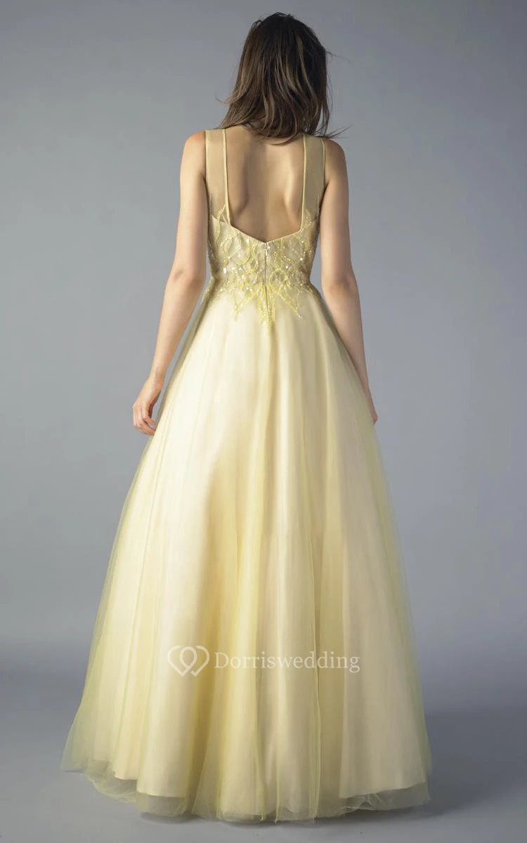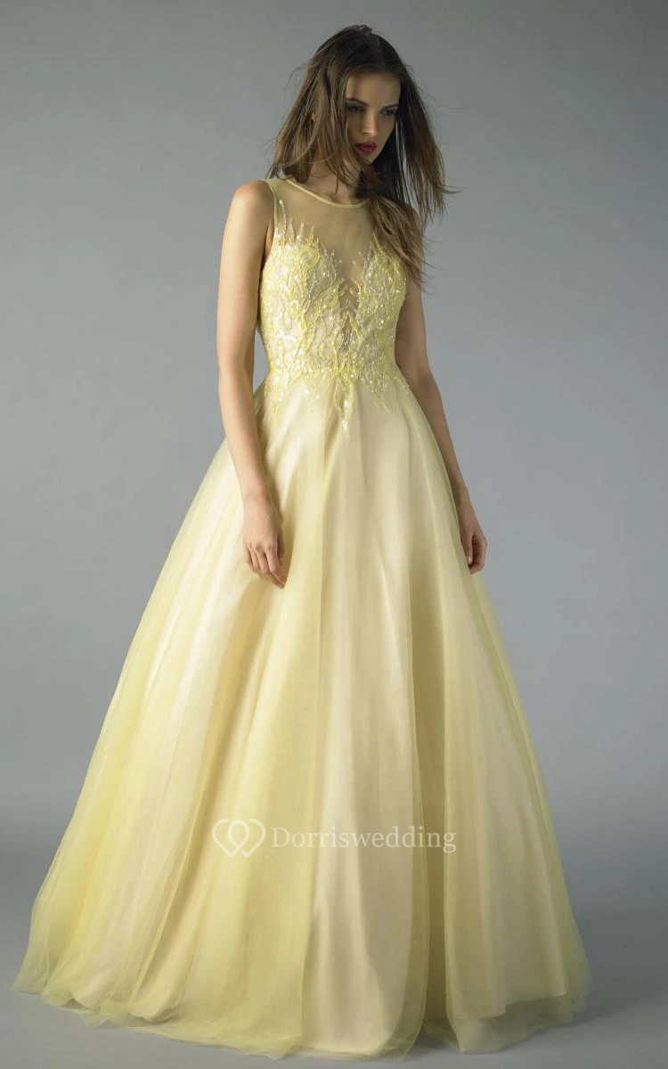 A-line Floor-length Jewel Sleeveless Tulle Zipper Dress