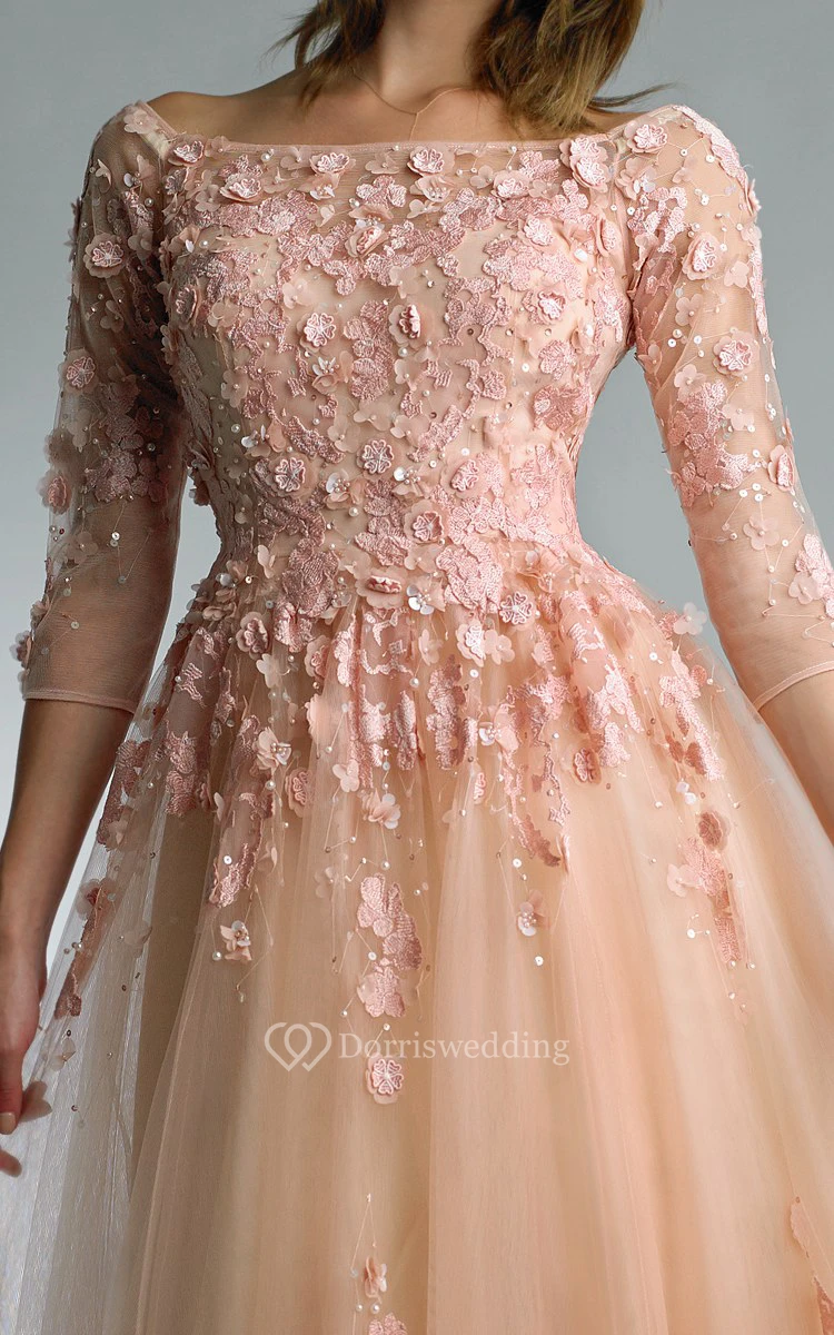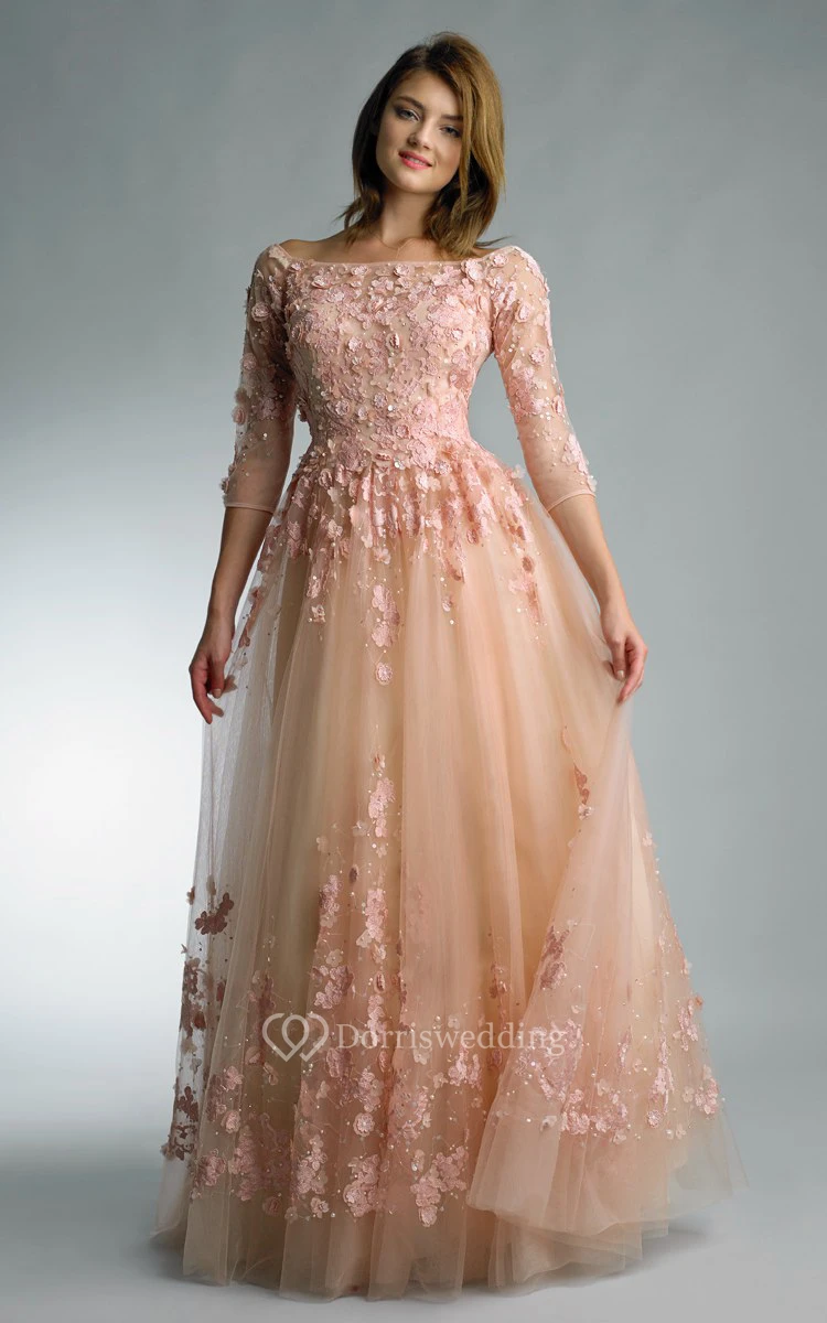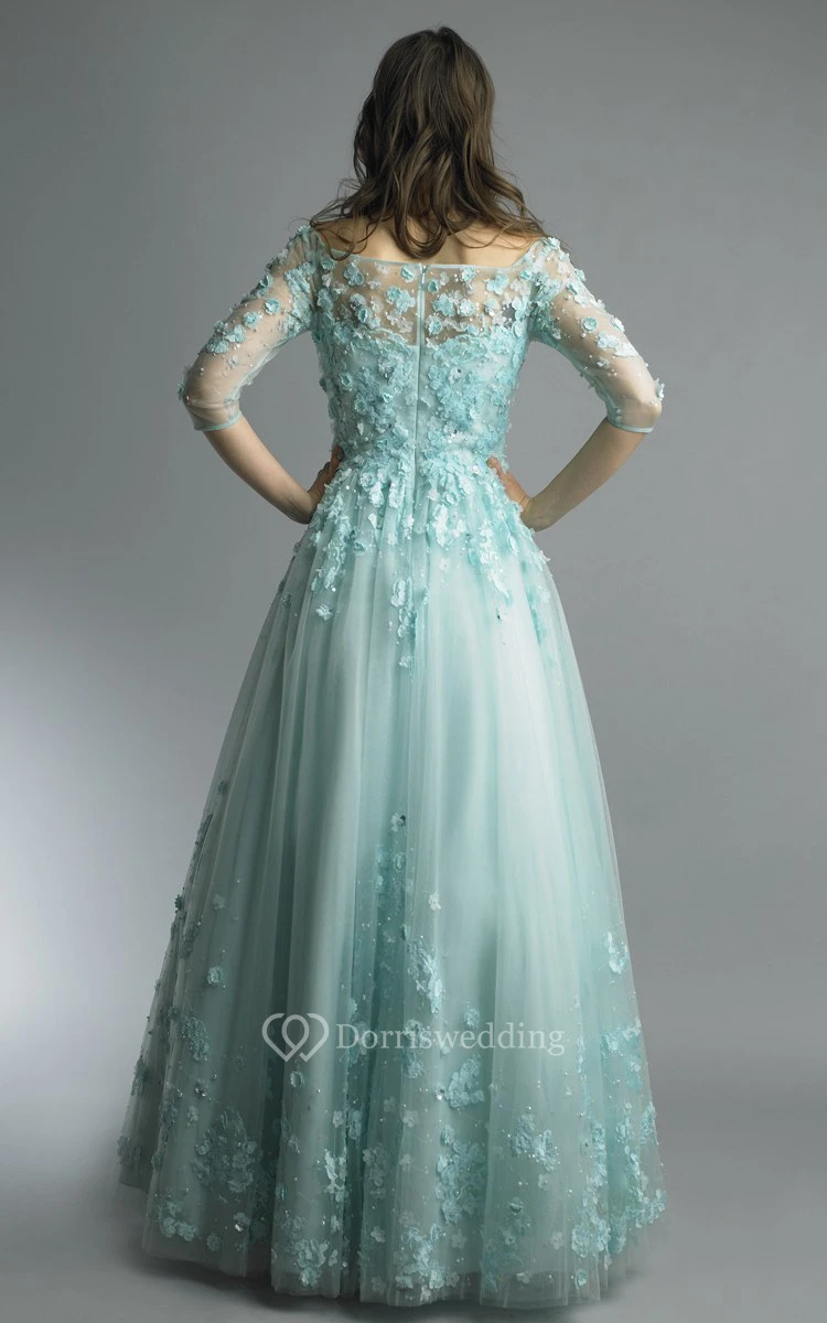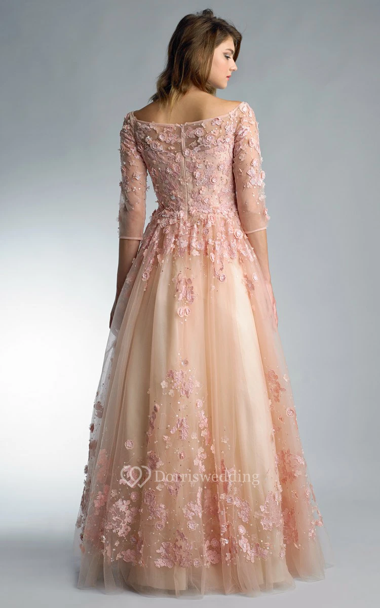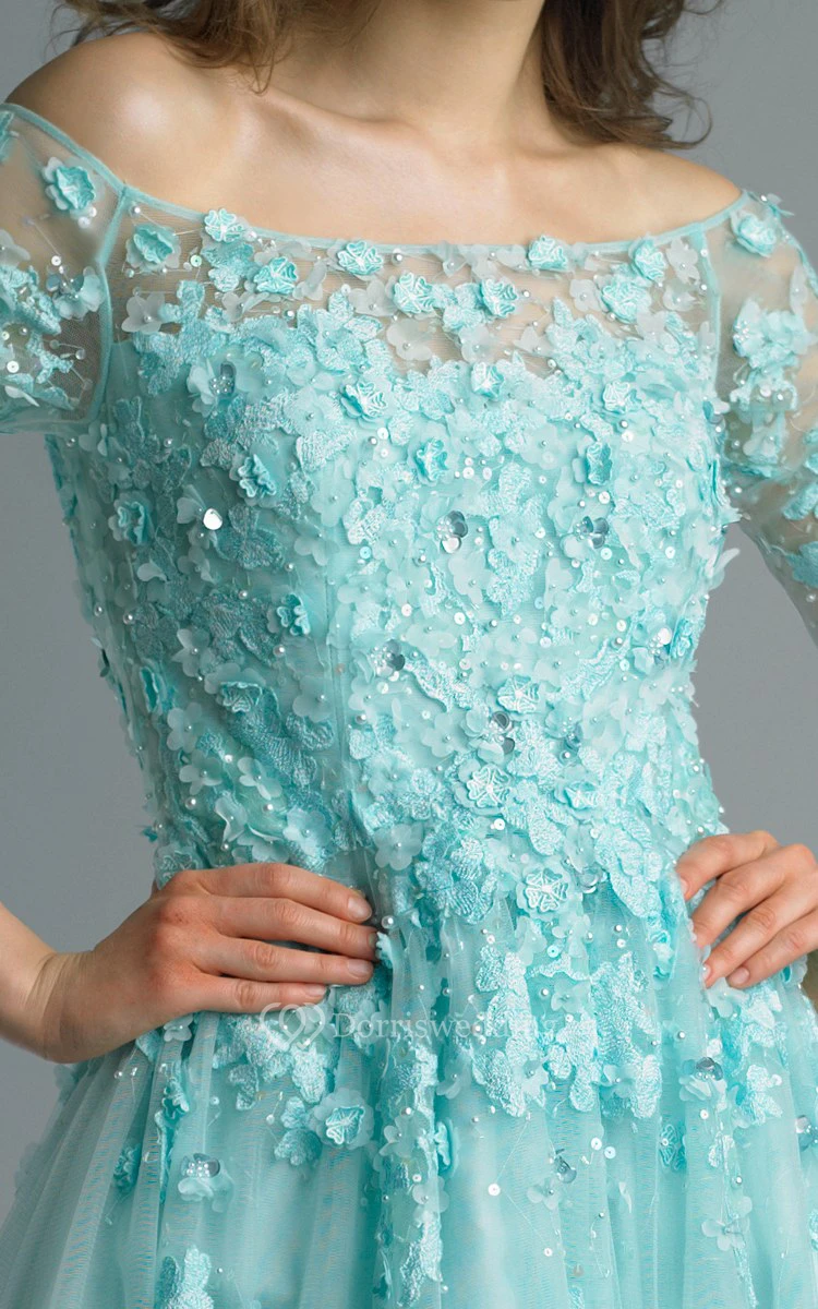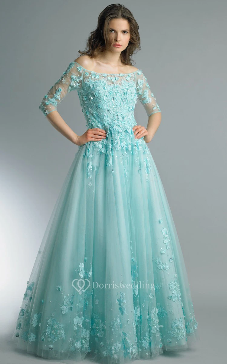 A-line Floor-length Off-the-shoulder Long Sleeve Tulle Zipper Dress