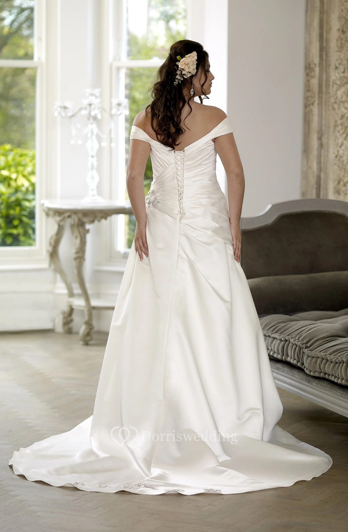 A-Line Floor-Length Off-The-Shoulder Satin Court Train Lace-Up Back Side Draping Dress