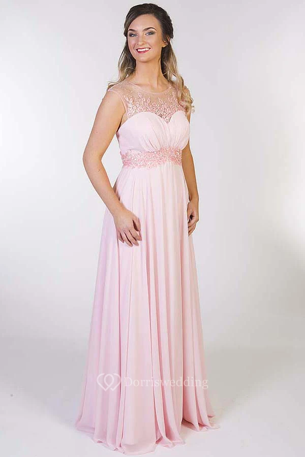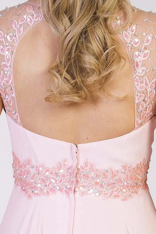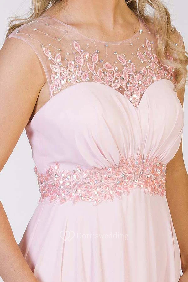 A-Line Floor-Length Scoop Cap-Sleeve Appliqued Chiffon Prom Dress With Keyhole Back And Pleats