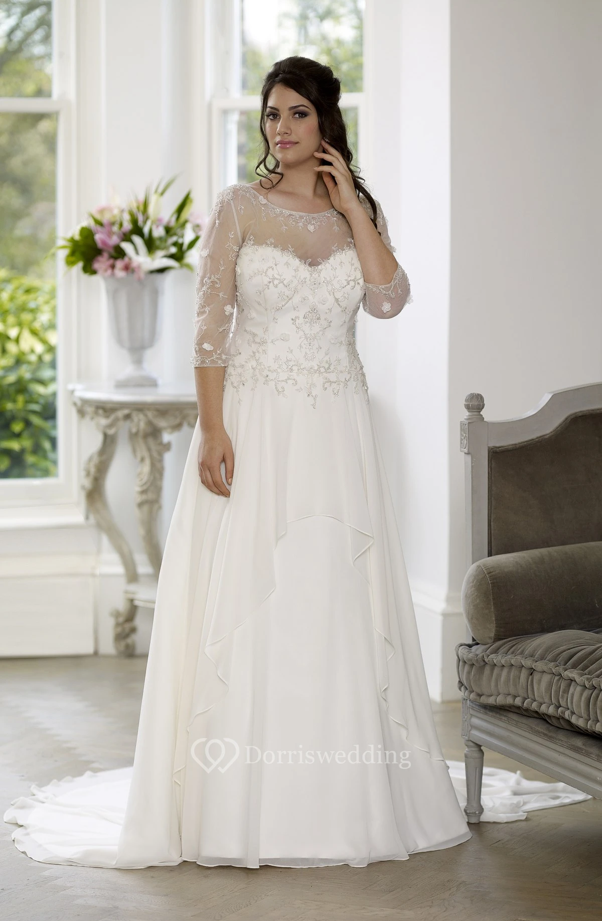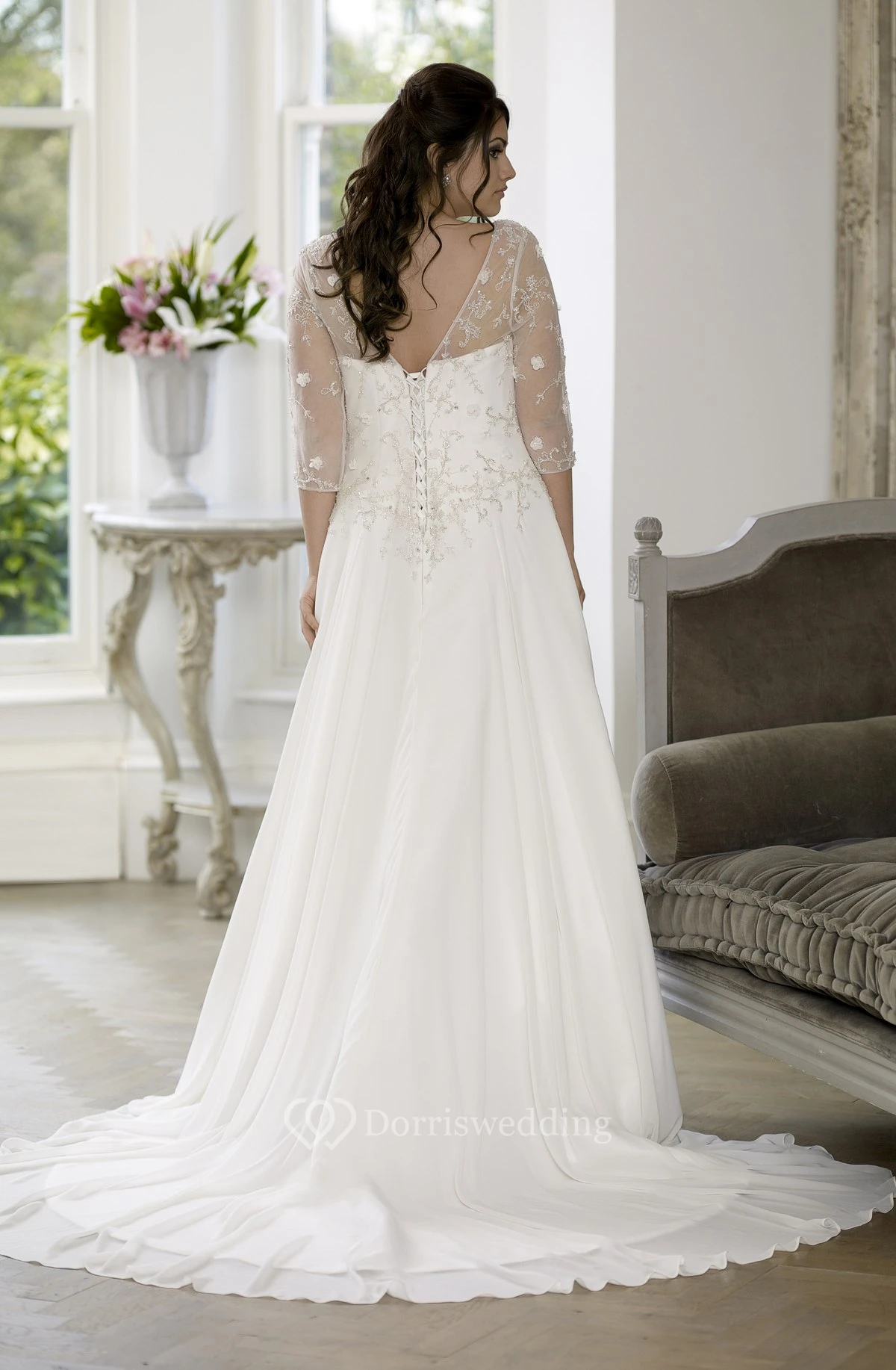 A-Line Floor-Length Scoop Neck 3-4-Sleeve Chiffon Satin Court Train Low-V Back Beading Dress