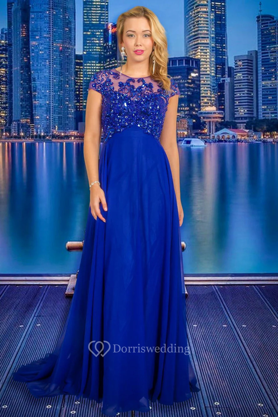 A-Line Floor-Length Scoop-Neck Cap-Sleeve Beaded Chiffon Prom Dress
