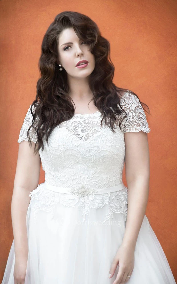 A-Line Floor-Length Scoop Neck Short Sleeve Tulle Appliques Dress