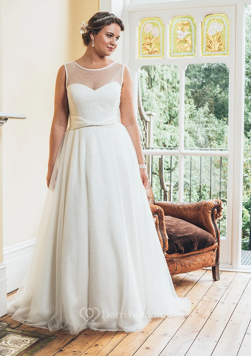 A-Line Floor-Length Scoop Neck Sleeveless Tulle Sweep Train Pleats Dress
