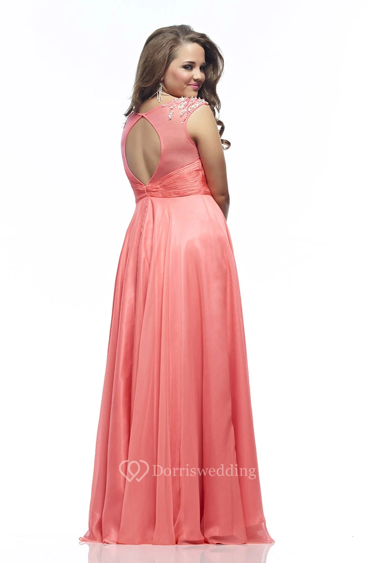 A-line Floor-length Scoop Sleeveless Jersey Beading Pleats Keyhole Dress