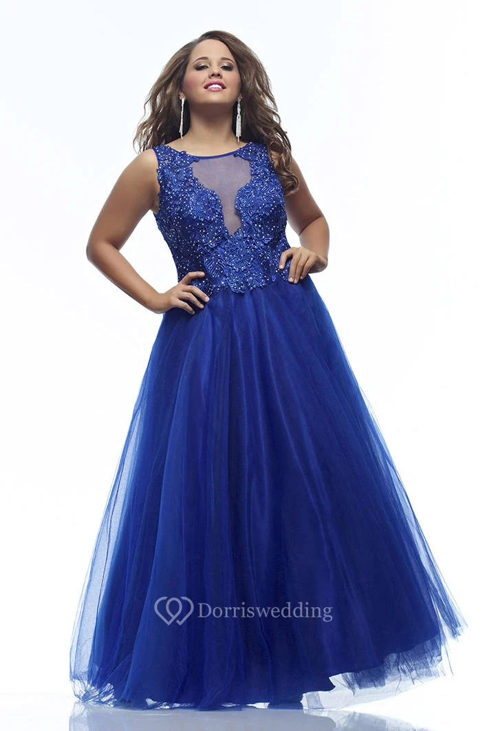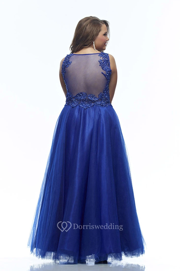 A-line Floor-length Scoop Sleeveless Tulle Appliques Illusion Dress