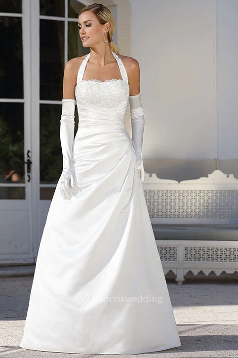 A-Line Floor-Length Side-Draped Halter Sleeveless Satin Wedding Dress With Beading