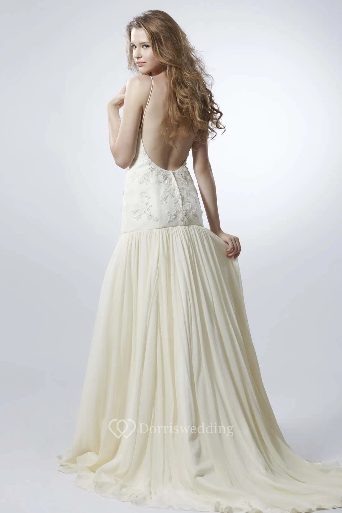 A-Line Floor-Length Sleeveless Beaded Spaghetti Chiffon Wedding Dress With Backless Style And Pleats