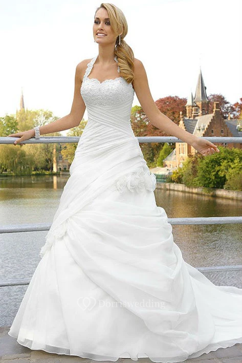 A-Line Floor-Length Sleeveless Halter Tulle Wedding Dress With Pick Up And Appliques