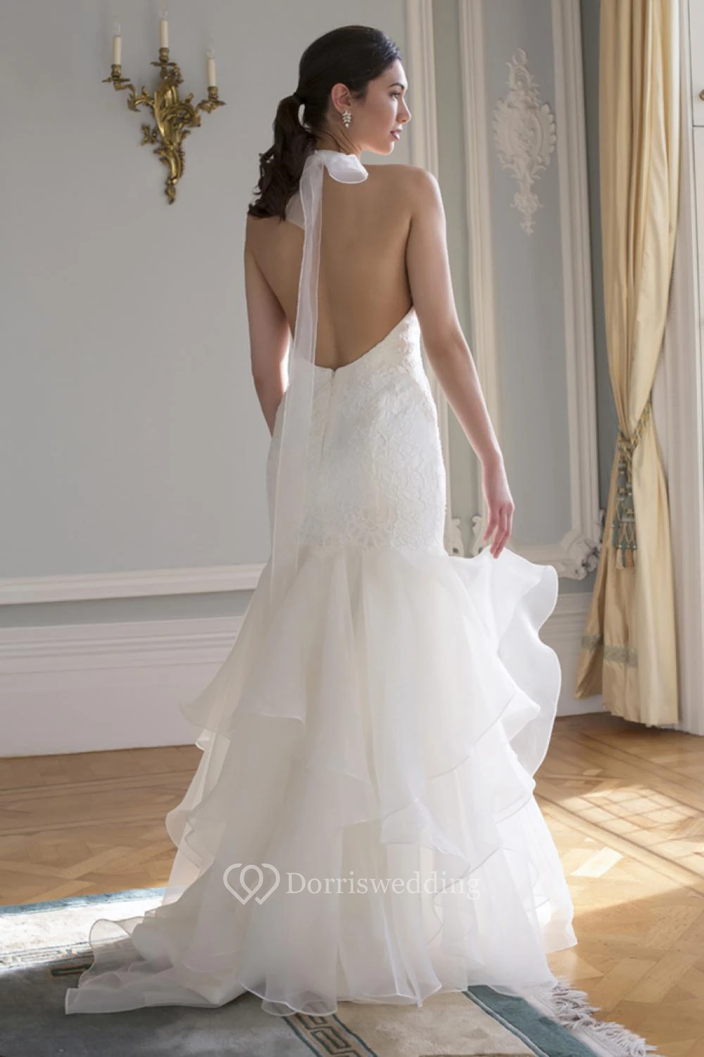 A-Line Floor-Length Sleeveless Haltered Organza&Lace Wedding Dress