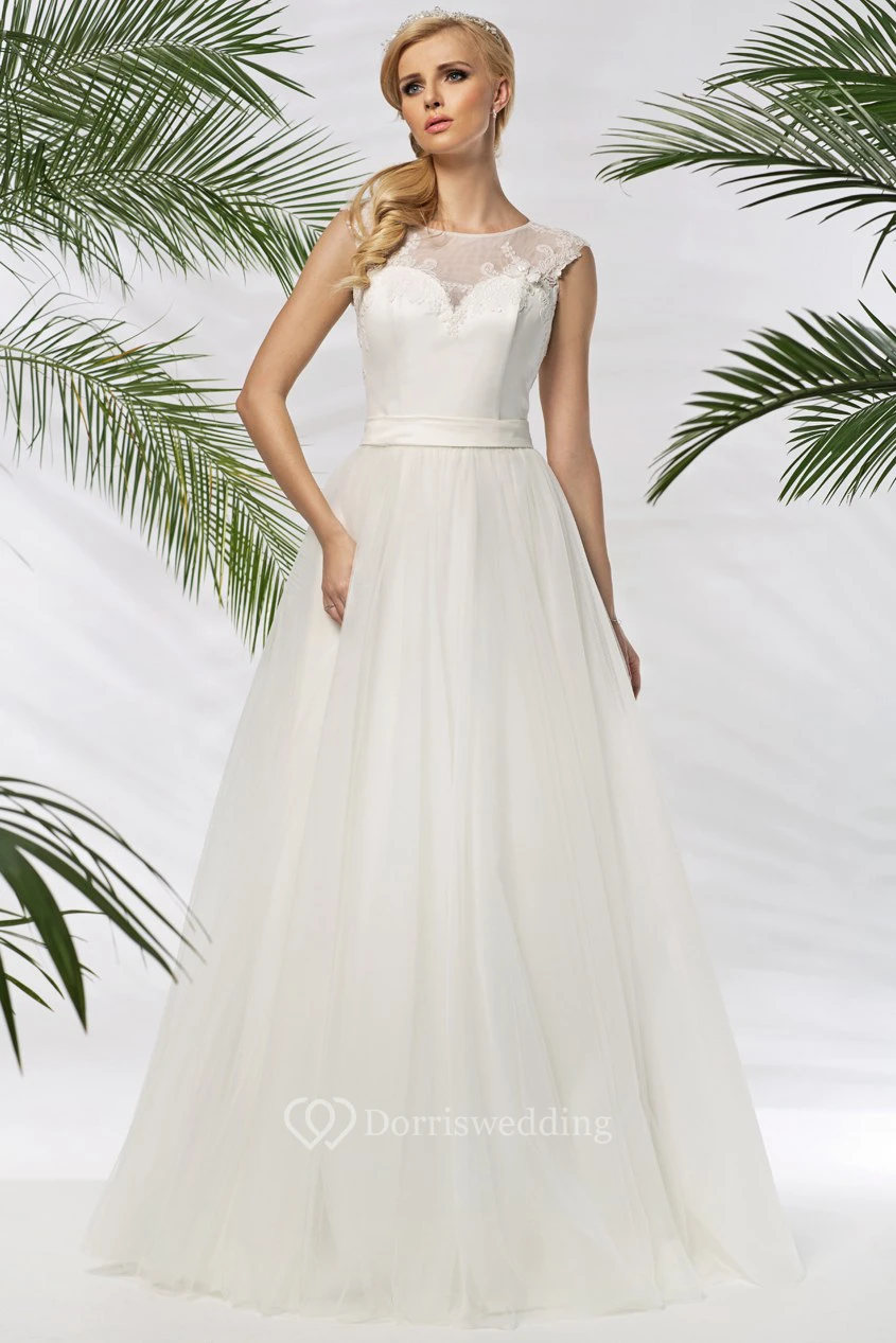 A-Line Floor-Length Sleeveless Scoop-Neck Appliqued Tulle&Satin Wedding Dress