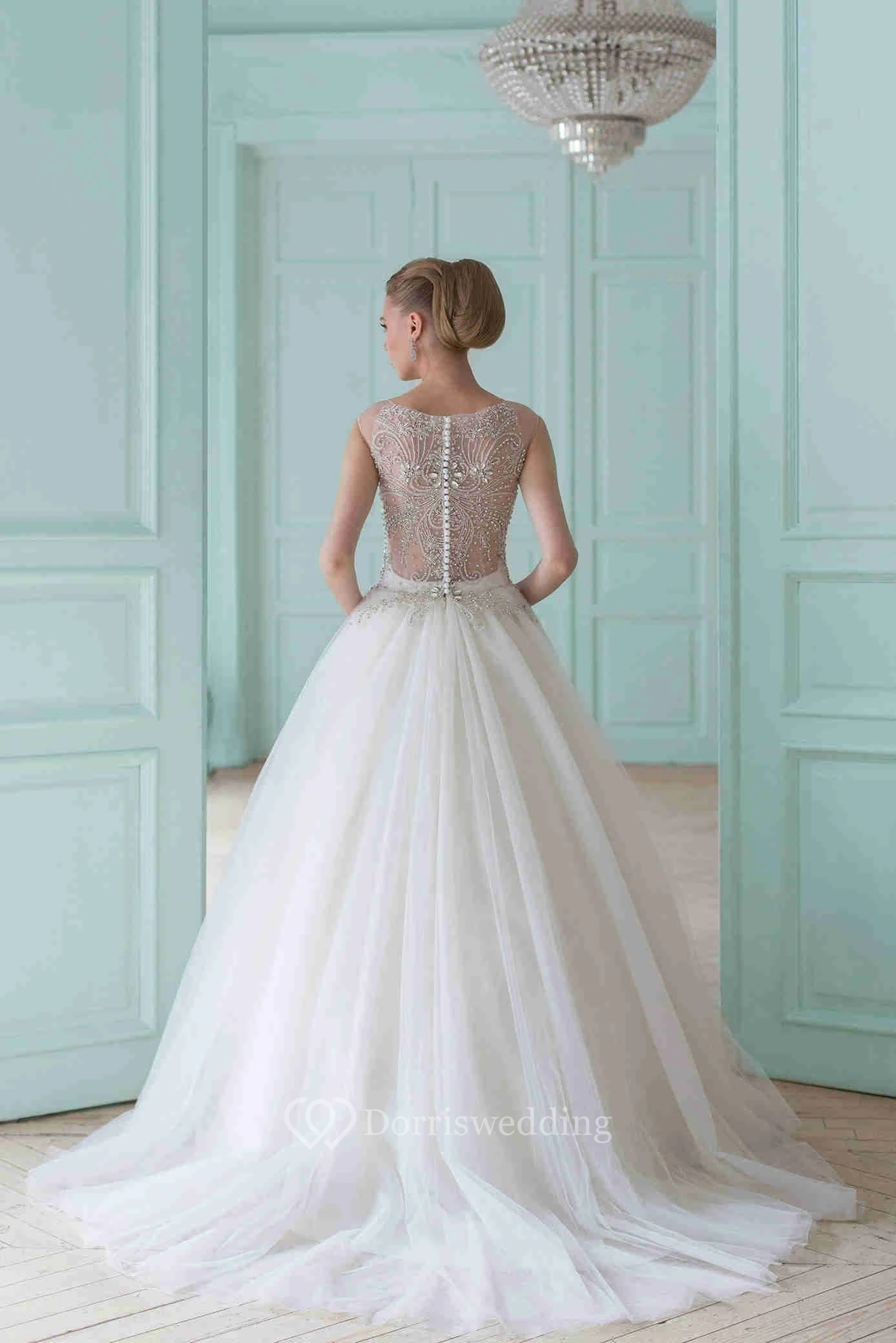 A-Line Floor-Length Sleeveless Scoop-Neck Beaded Tulle Wedding Dress With Ruffles