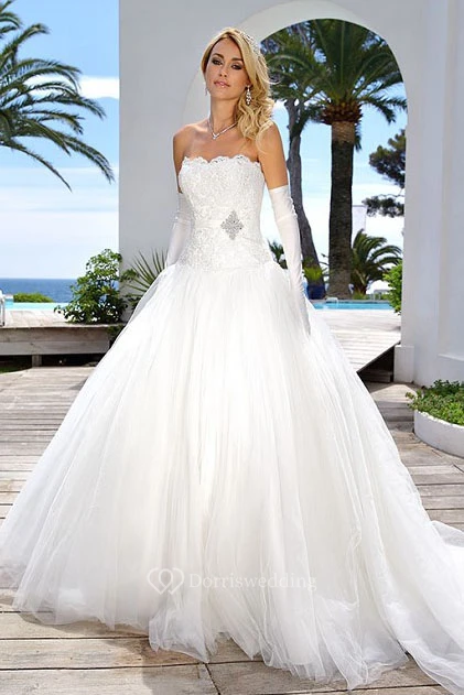 A-Line Floor-Length Sleeveless Strapless Appliqued Tulle&Lace Wedding Dress With Broach
