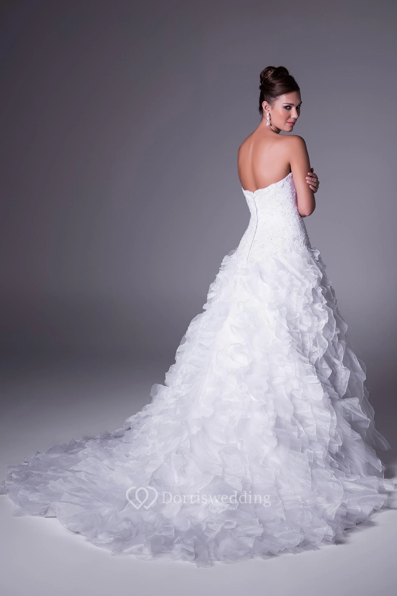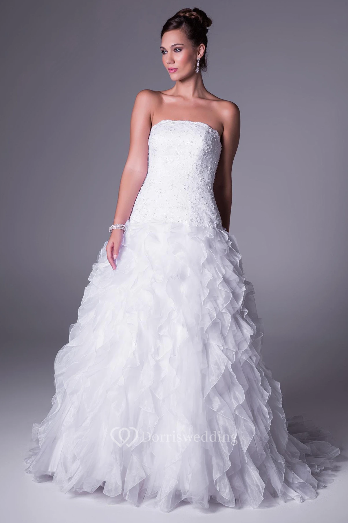 A-Line Floor-Length Sleeveless Strapless Cascading-Ruffle Organza Wedding Dress With Beading