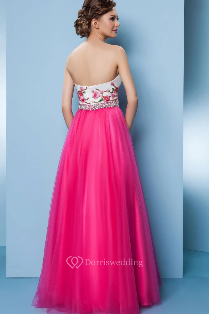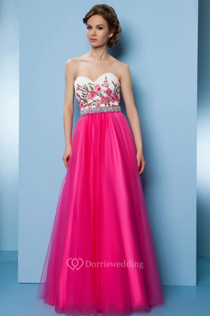 A-Line Floor-Length Sleeveless Sweetheart Embroidered Tulle&Satin Prom Dress With Beading