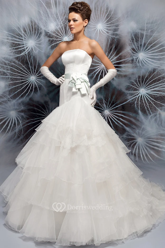 A-Line Floor-Length Sleeveless Tiered Strapless Satin&Tulle Wedding Dress With Lace And Bow