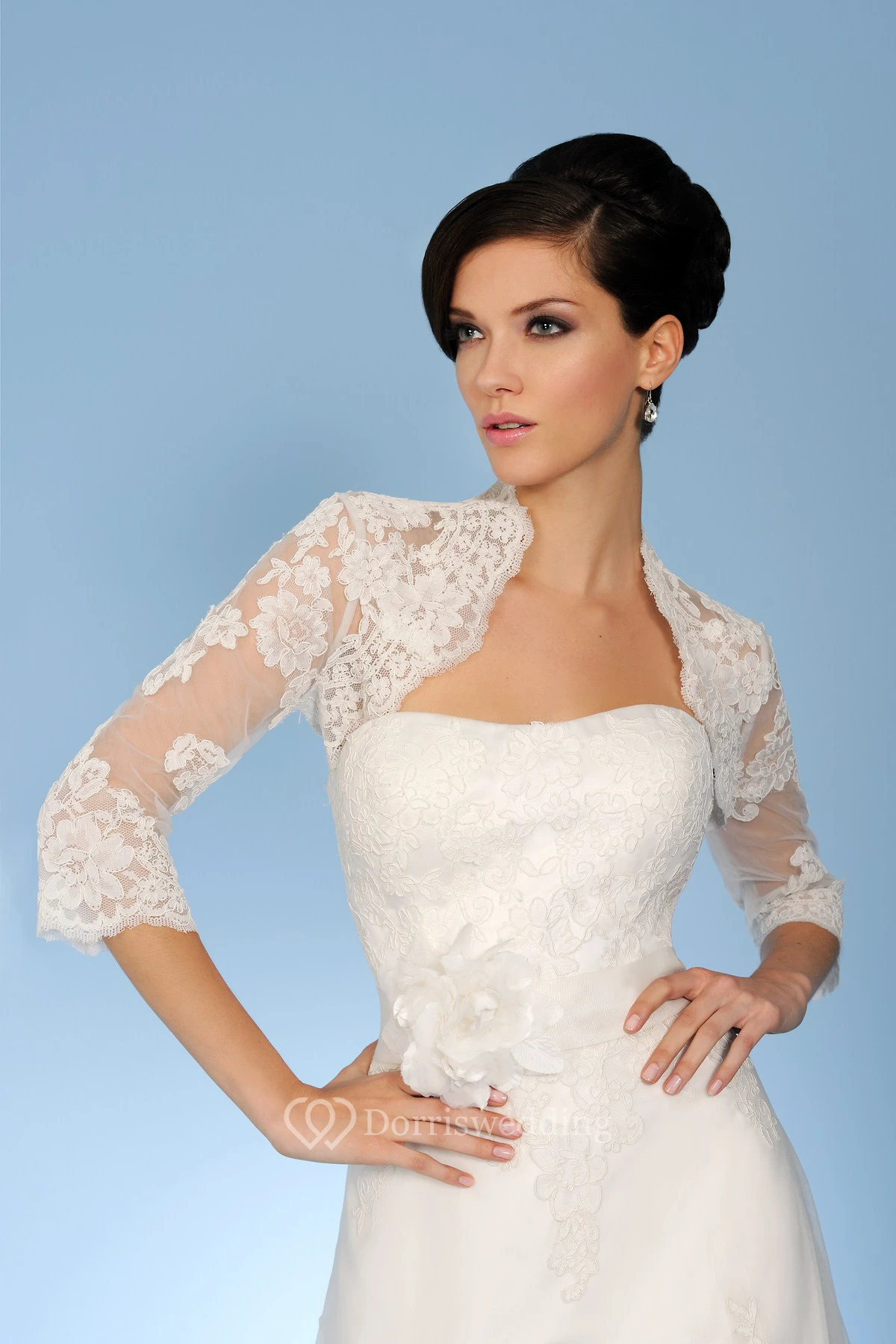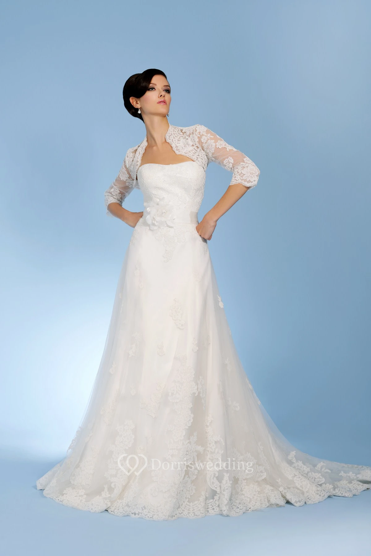 A-Line Floor-Length Strapless Caped 3-4-Sleeve Lace Wedding Dress With Appliques And Flower