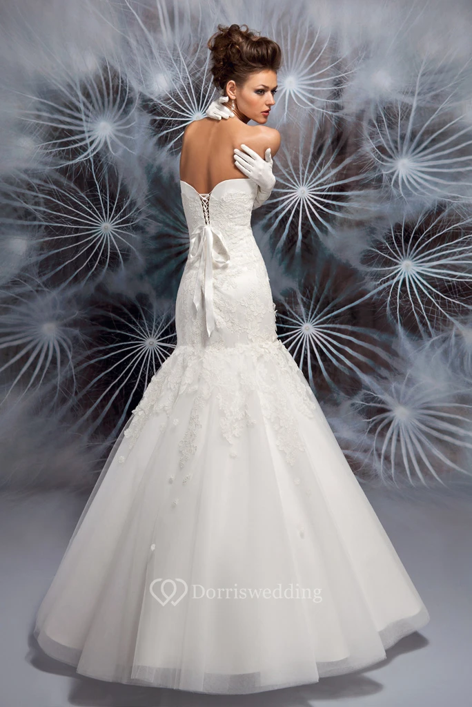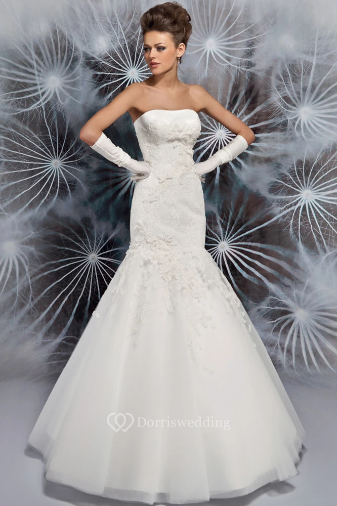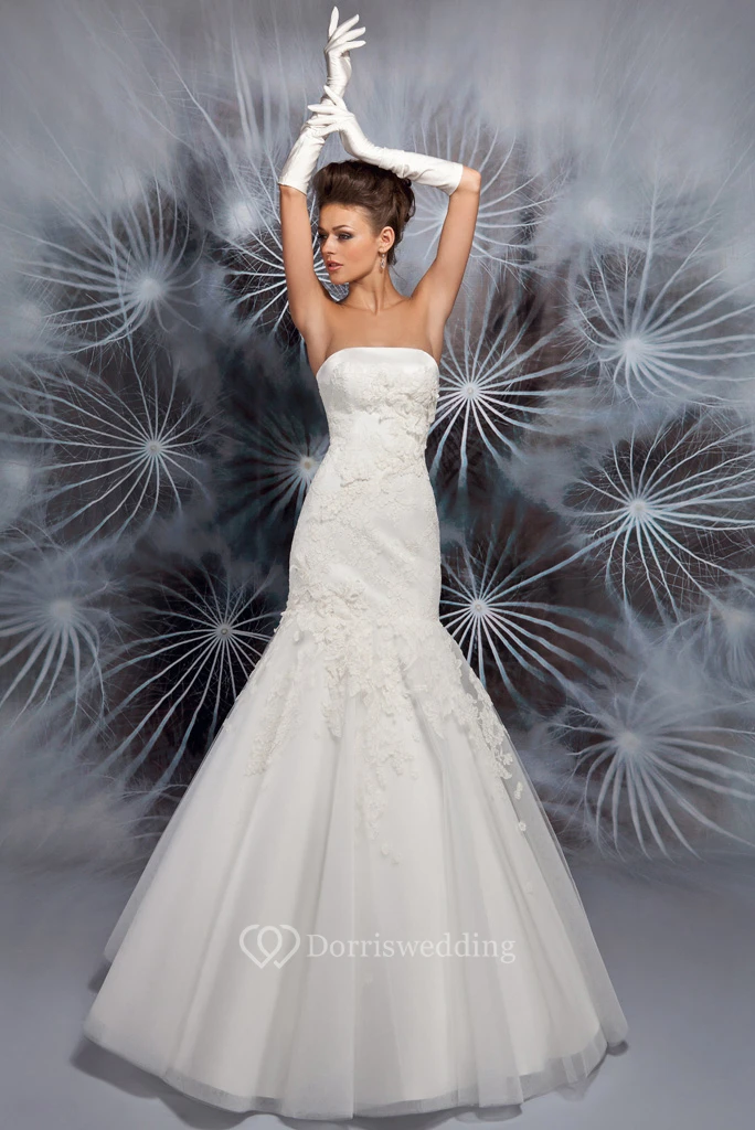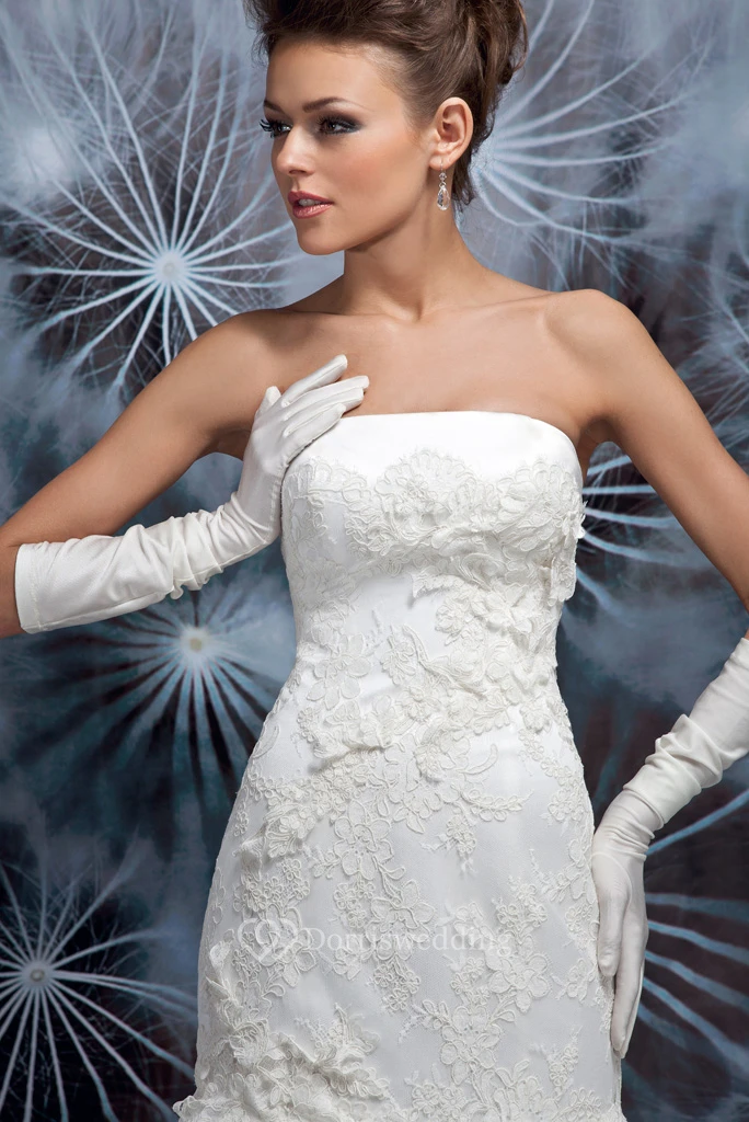 A-Line Floor-Length Strapless Sleeveless Appliqued Satin&Lace Wedding Dress With Lace-Up Back And Bow